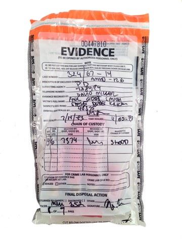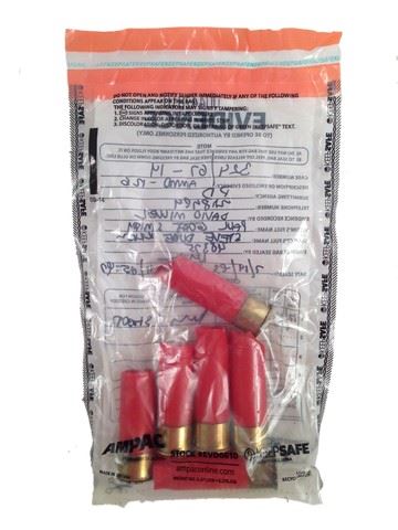 Police clear plastic with orange border 'Evidence' bag with handwritten notes and 6 spent shotgun shells (10"x5").