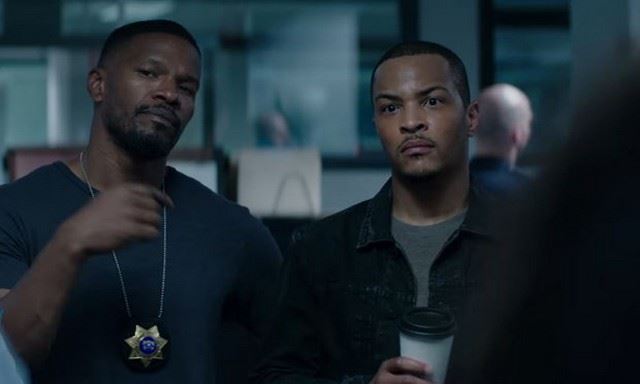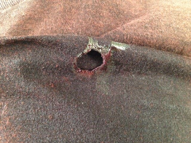 Sleepless -Sean (T.I.) screen worn, hero bloody outfit, including: 'American Apparel 50/25/25) bloodied with bullet hole in chest heathered light brown tee (S), 'Attacc Raw' grey, straight leg jeans 33/32, and 'All Saints' bloody denim jacket (L). Featured prominently when Sean is killed in the Luxus Casino garage. "#6 Sean Bloody" wardrobe tag included.