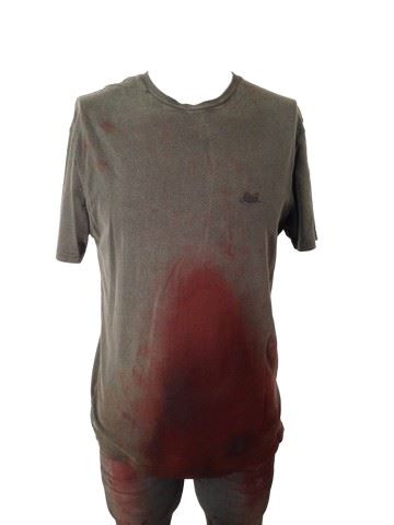 Sleepless -Thomas (Octavius J. Johnson) screen used, hero, bloody outfit, including: 'Koto' plaid flannel shirt with dried blood on sleeves and button hem (XS-TP), 'Diesel' grey skinny low rise jeans with blood all over (29x30), and 'Topman' green pullover with blood all over (UK 9). Prominently displayed at the end of the movie in the hospital. Includes wardrobe tag.