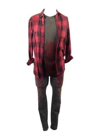 Sleepless -Thomas (Octavius J. Johnson) screen used, hero, bloody outfit, including: 'Koto' plaid flannel shirt with dried blood on sleeves and button hem (XS-TP), 'Diesel' grey skinny low rise jeans with blood all over (29x30), and 'Topman' green pullover with blood all over (UK 9). Prominently displayed at the end of the movie in the hospital. Includes wardrobe tag.