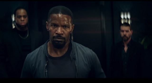 Sleepless -Vincent Downs (Jamie Foxx) screen worn, hero bloody change #3, including: 'Hudson' straight jeans with blood stain on the inner left front pocket (36), 'Baracuta' navy windbreaker (44), and 'Rag & Bone' distressed bloody and torn for production charcoal knit tee (M). Wardrobe tag included.