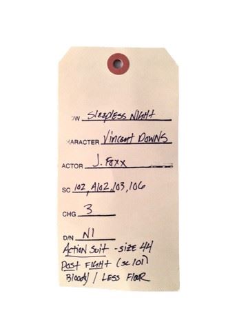 Vincent Downs (Jamie Foxx) screen worn, hero action suit, including 2 piece 'Giorgio Armani' charcoal suit stained with flour from Vincent's fight with McFerrin (Tim Connolly) in the Luxus Casino kitchen, and white 'Boss' long sleeve dress shirt stained with blood from when Vincent was stabbed during the kidnapping of his son Thomas (Octavius J. Johnson) (L). Includes wardrobe tag.