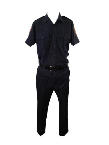 Vincent Downs (Jamie Foxx) screen worn, hero bloody police uniform, including: 'Flying Cross' black plain front trousers (36), 'Flying Cross' black zipper front shirt with blood spatter on the police shoulder patches (16), black leather belt with sticky blood around the buckle (38). Includes wardrobe tag.