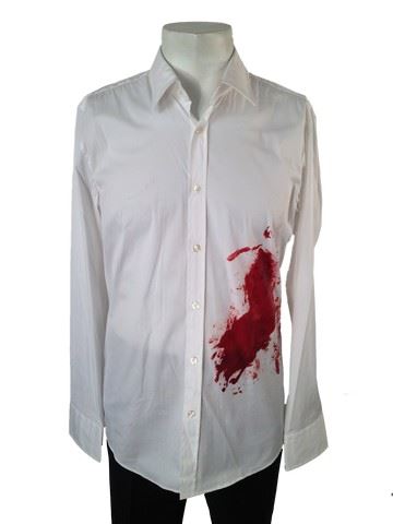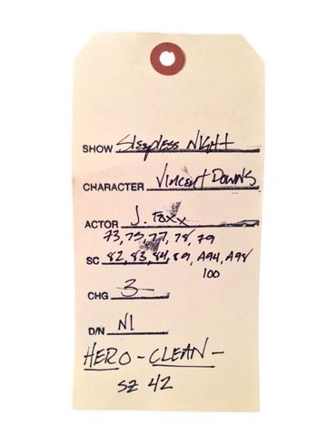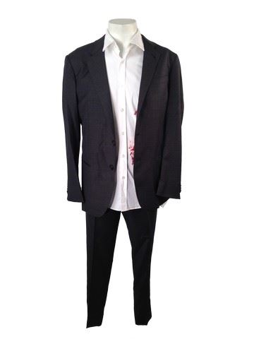 Vincent Downs (Jamie Foxx) screen worn, hero bloody suit, including 2 piece 'Giorgio Armani' charcoal suit (42), and white 'Boss' long sleeve dress shirt stained with blood from when Vincent was stabbed during the kidnapping of his son Thomas (Octavius J. Johnson) (L). Includes wardrobe tag.