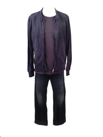 Vincent Downs (Jamie Foxx) screen worn, hero change #2, including 'Hudson' straight jeans (36), 'Baracuta' navy windbreaker (44) and 'Rag & Bone' charcoal knit crew tee. Includes wardrobe tag.