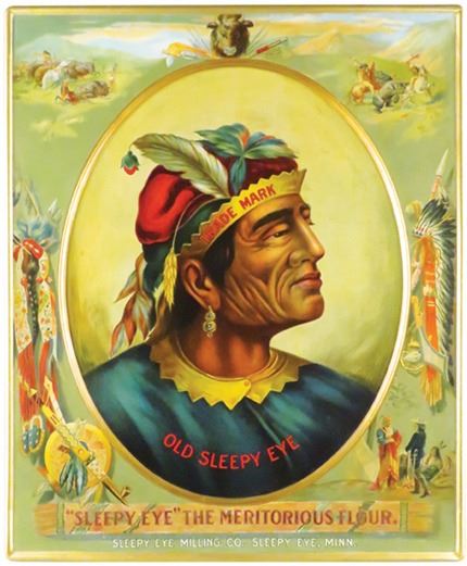 Sleepy Eye Flour Self Framed Tin Sign. Old Sleepy Eye in center with vingnettes around perimeter. Slight crease at top and restored condition. 20 X 24 inches.