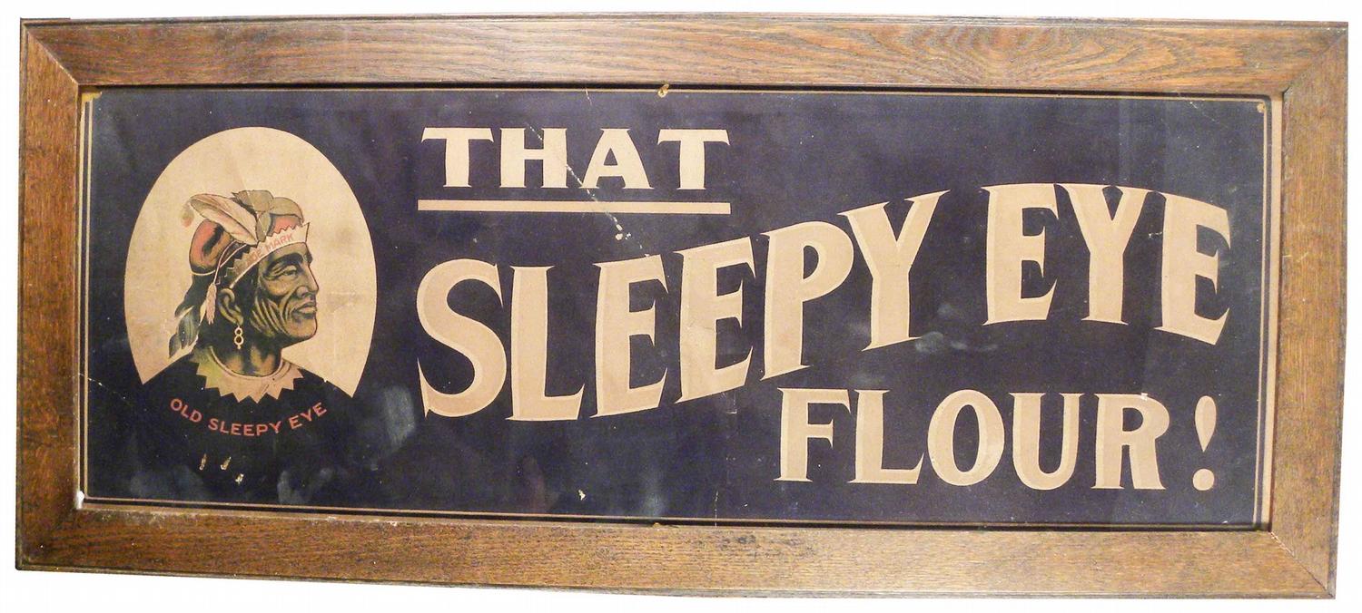 Sleepy Eye Heavy Indoor/Outdoor Paper Sign. Ca. 1910. Framed under glass. Tears, wrinkles and paper loss. Fair condition. 33 1/2 X 12 1/2 inches image only.