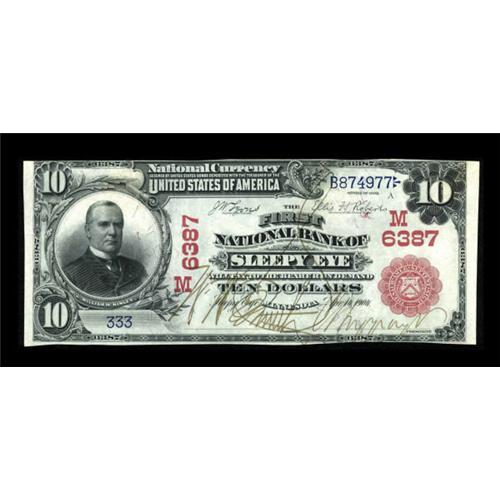 <B>Sleepy Eye, MN</B></I> - $10 1902 Red Seal Fr. 613 <B>The First NB</B></I> Ch. # (M)6387<BR> A lovely Red Seal from one of the most sought after locations in the country. Every "name" collector of National Bank Notes aspires to own a note from Sleepy Eye, and those who are serious about owning the best want to own a high grade Red Seal from here. The town takes its name from Chief Sleepy Eye, a Sioux leader who met with President James Monroe in 1824 and was instrumental in agreeing to a treaty giving up much of the Sioux land in western Minnesota. A dozen or so Red Seals have been reported on this bank for at least fifty years, with appearances now limited to occasions when old time collections are dispersed. Track and Price shows two such notes being offered at public sale during the past ten years, which seems about right to us. This piece is a pen signed beauty, with the classic Sleepy Eye vanity signature of the cashier. Bright <B>About Uncirculated,</B></I> a real winner of a note. <BR><BR><b>Shipping:</b> Coins & Currency (<a target="_blank" href="http://www.heritageauctions.com/common/shipping.php">view shipping information</a>)