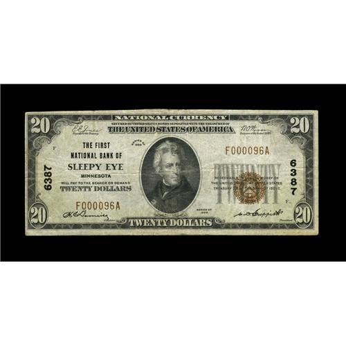 <B>Sleepy Eye, MN</B></I> - $20 1929 Ty. 1 <B>The First NB</B></I> Ch. # 6387<BR>A nice small example from this always in demand community. Pleasing <B>Fine+.</B></I>