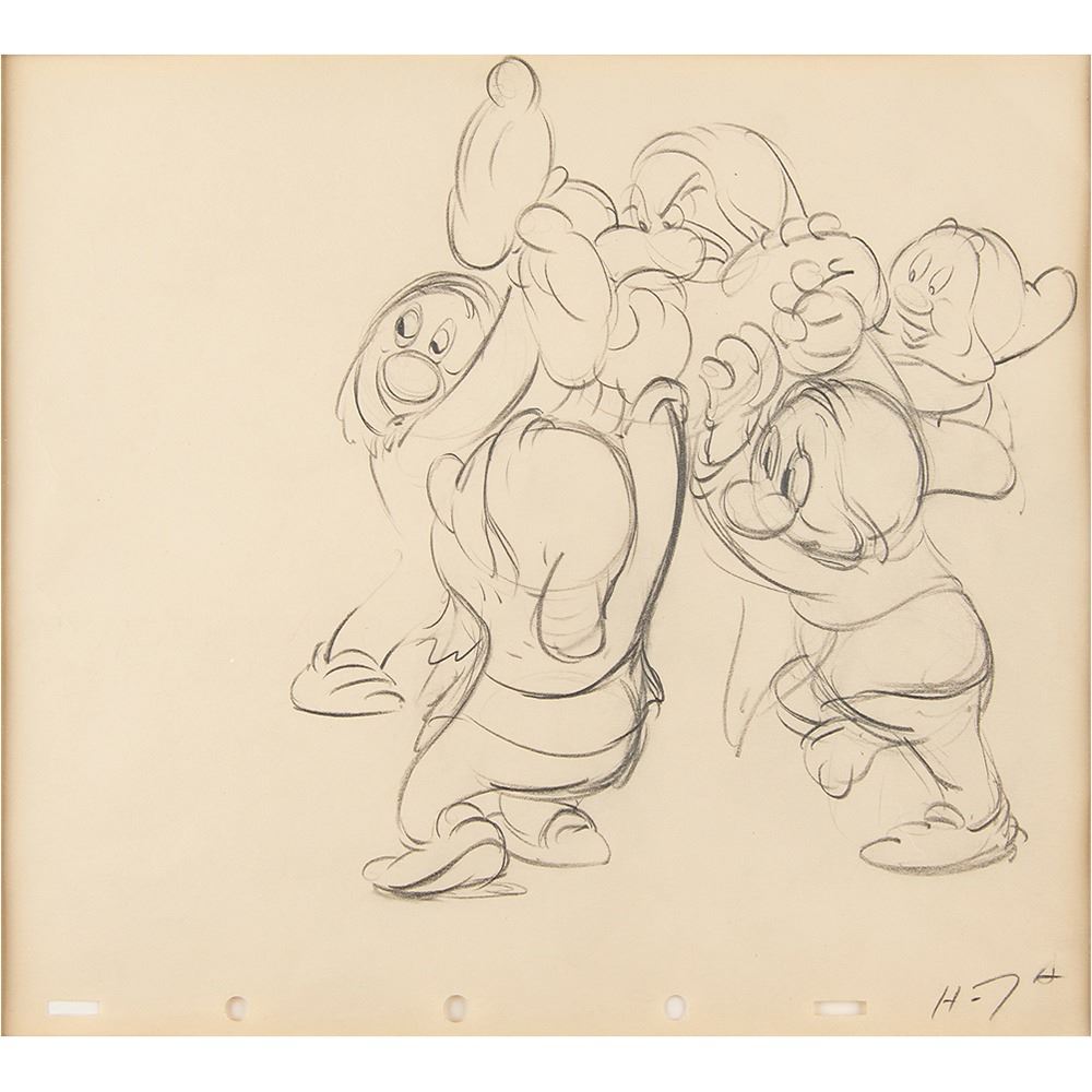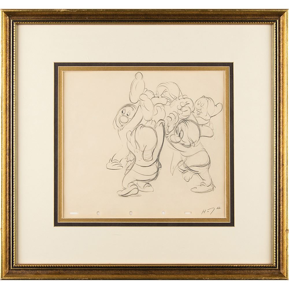 (Walt Disney Studios, 1937) Excellent original production drawing of Sleepy, Happy, Sneezy, Bashful, and Grumpy from Snow White and the Seven Dwarfs, depicting the ornery dwarf being carried to a water basin during the film's memorable washing sequence. Accomplished in graphite on 10 x 9 animation paper marked "H-7" in the lower right corner. Total character image measures 7 x 7.5. Triple-matted and framed to an overall size of 17.5 x 16.5; frame backing bears a certificate of authenticity from the Toon Publishing Group. In fine condition. An appealing five-dwarf drawing with superb action and detail.