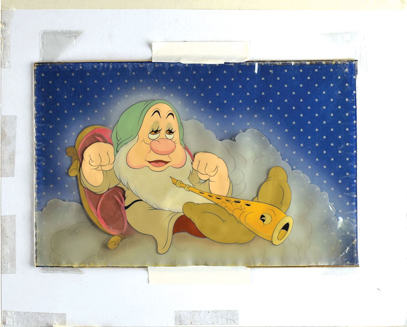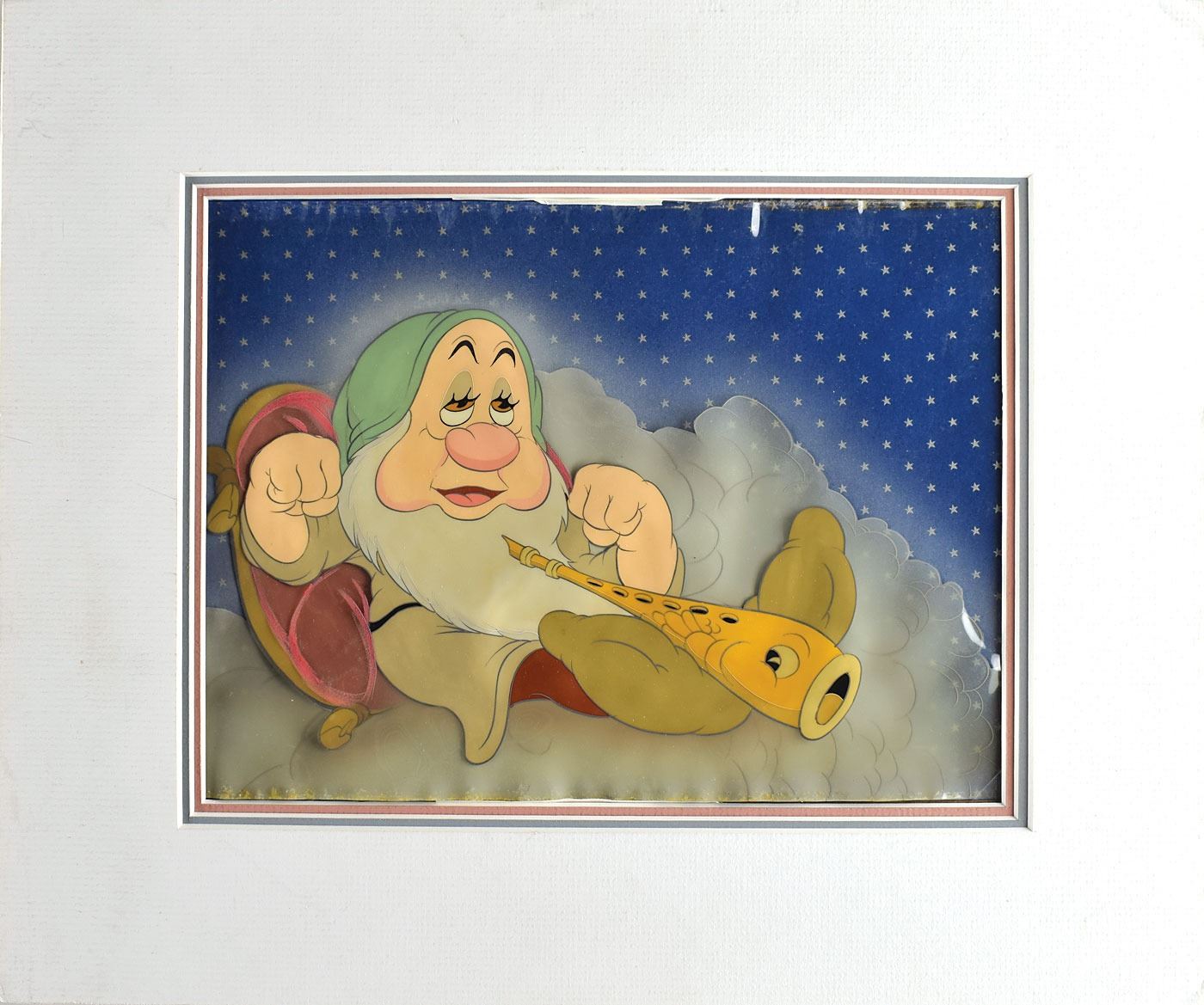 (Walt Disney Studios, 1937) Original production cel featuring a huge image of Sleepy from Snow White and the Seven Dwarfs, showing the classic character reclining on a pillow with a fish-shaped flute in his lap. The cel has been applied to an airbrushed starry background as prepared by Courvoisier Galleries for sale. Image measures 7 x 5.5, with a mat opening of 9 x 7. Triple-matted to an overall size of 14 x 11.75. In fine condition. A handsome set-up portraying one of Snow White's beloved seven dwarfs.
