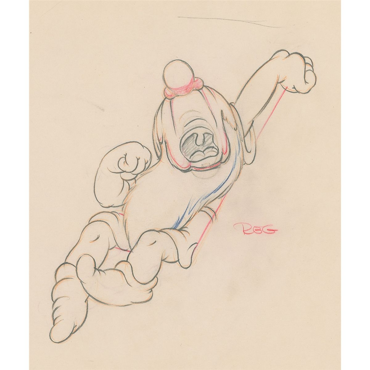 (Walt Disney Studios, 1937) Original production drawing featuring Sleepy the Dwarf from Snow White and the Seven Dwarfs, showing him in a humorous and desirable yawning pose. Accomplished in graphite and colored pencil on untrimmed 12 x 10 animation paper. Image measures 6 x 6.5. In fine condition.