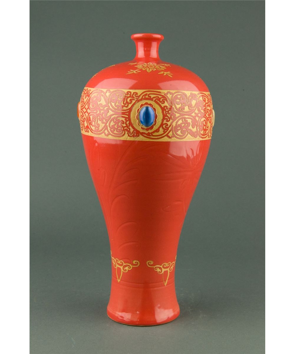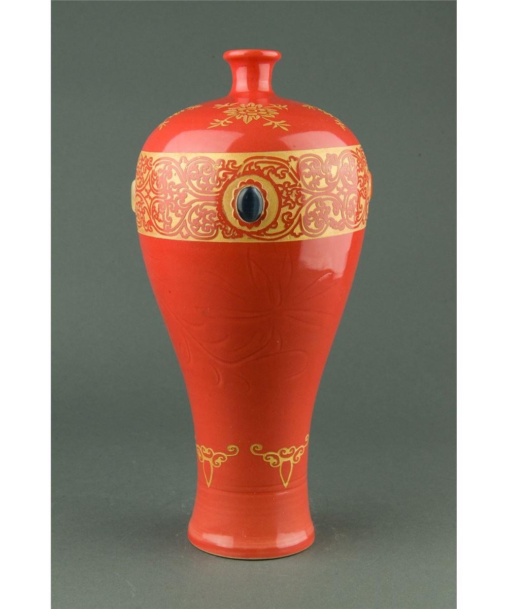 Tall Chinese coral ground Meiping vase, of Meiping form with narrow waist, decorated with frieze of sprigs surround with a painted gem on shoulder, with low relief foliage carvings on body. Bottom incised artist name Ma Ding. H: 31 cm, D: 14 cm, 777 grams.
