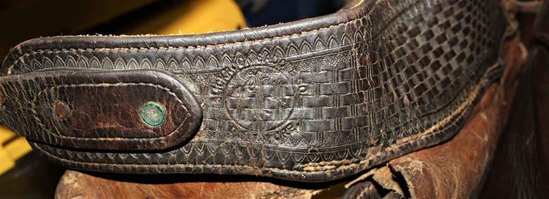 Large batwing chaps with stylish swirling stud design, 10 large nickel saddlestring conchos, and wide basket stamped belt with uncommon maker's mark.
