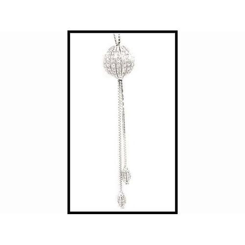 This lovely 18K white gold necklace is set with 174 diamonds that total approximately 1 1/2 carats. Entire piece measures 32 inches at the long. The slide is 15mm (9/16") long x 13mm (1/2") wide. The bottom ornaments are 11mm x 5mm.