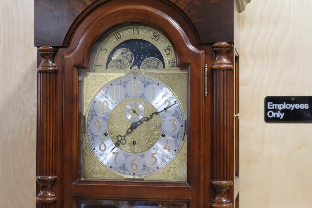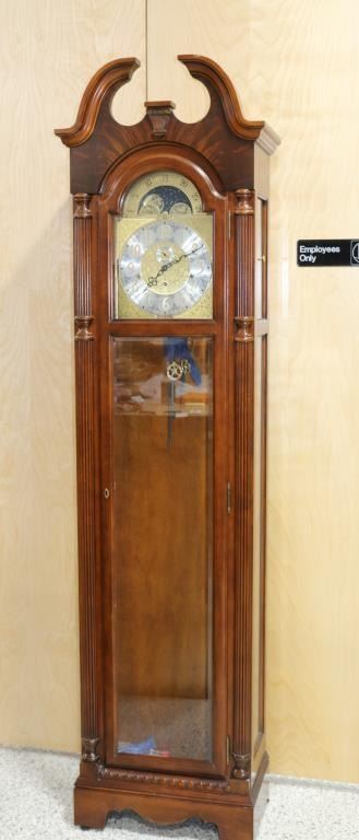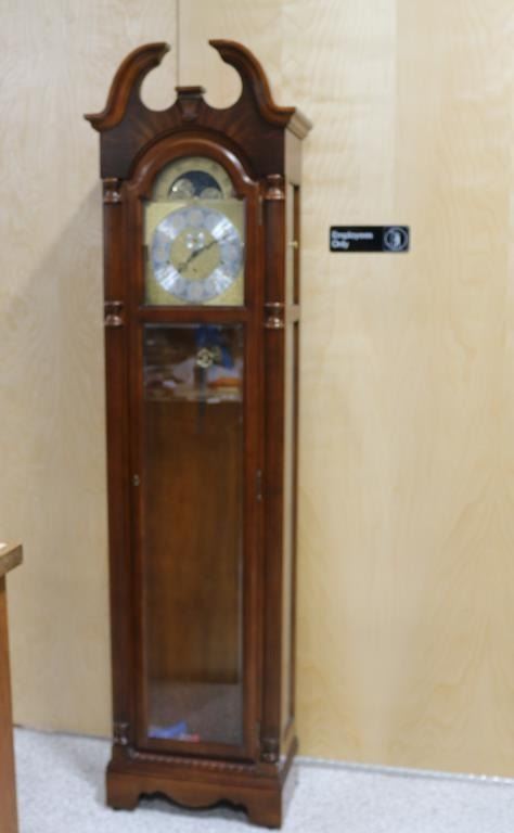 Model No. 0826-1-NW. Made in the USA. Brass face with walnut case. Beveled glass door front, side glass panels. Measures 83" tall, 19" wide, 10" deep. **Shipping must be arranged by buyer or local pickup only.**