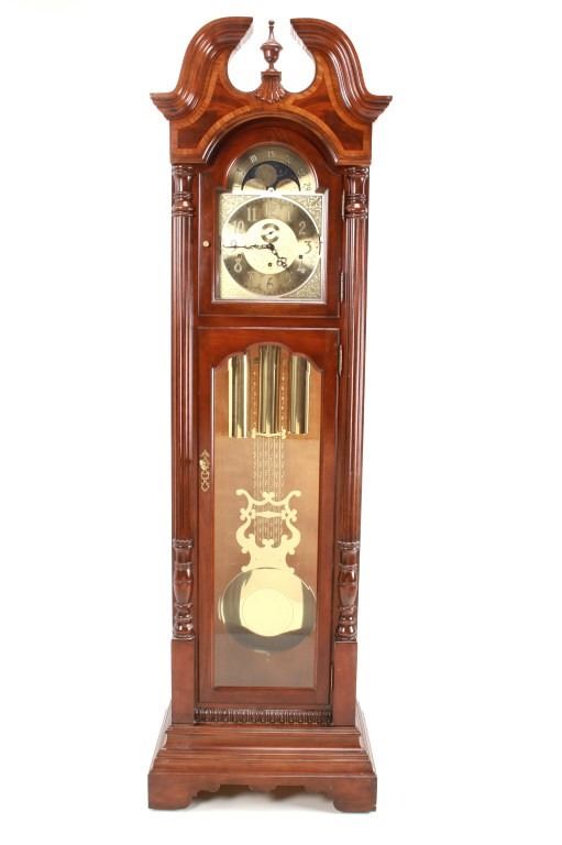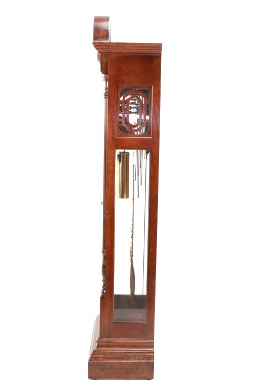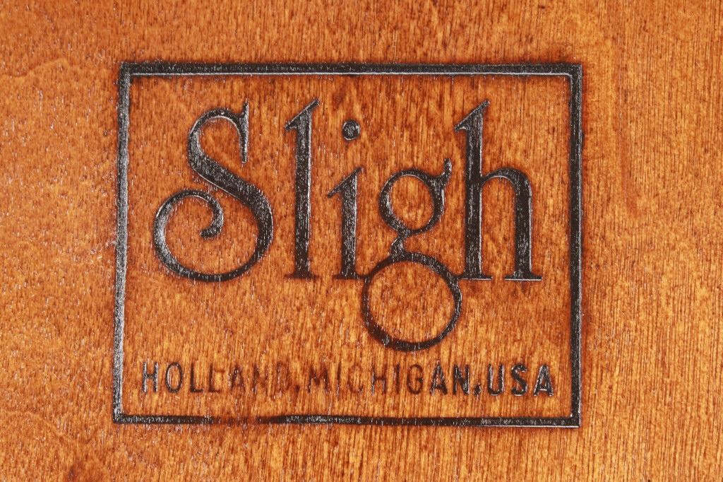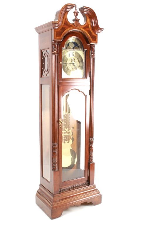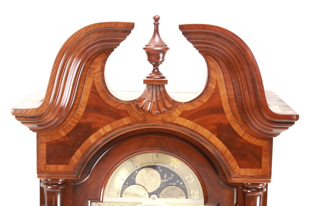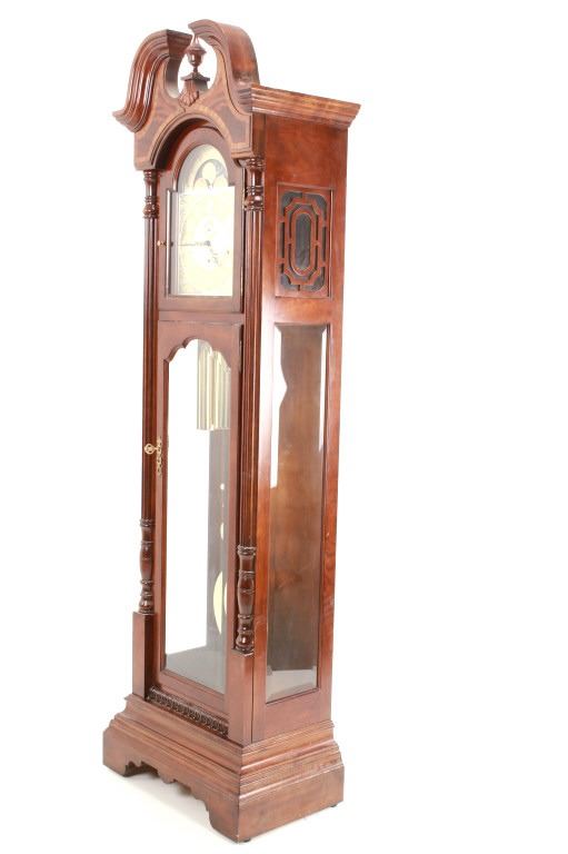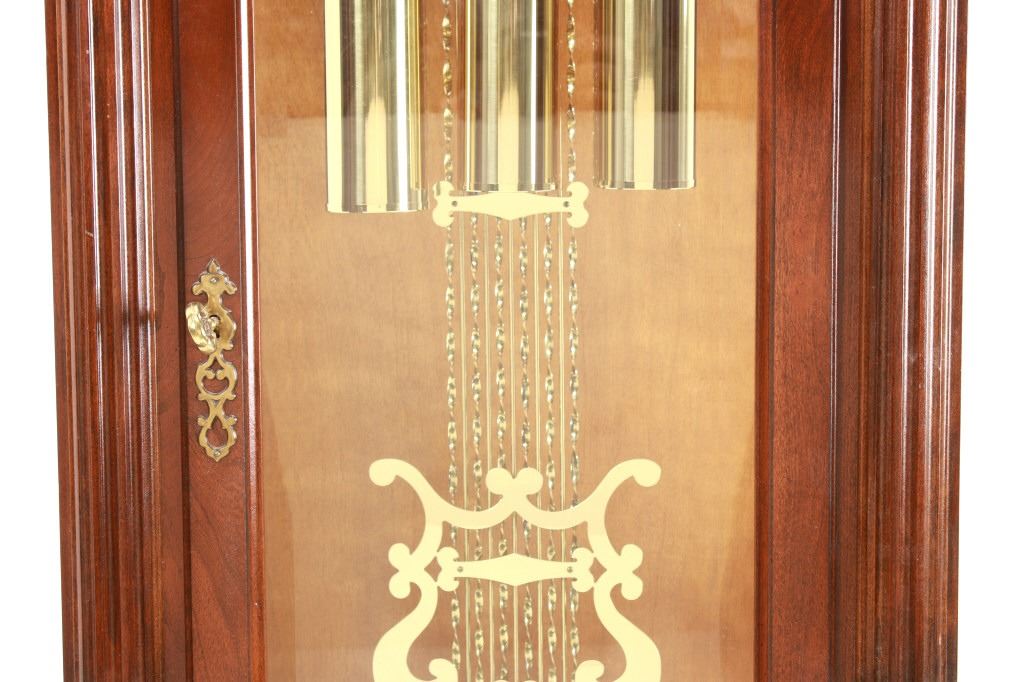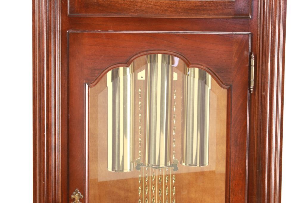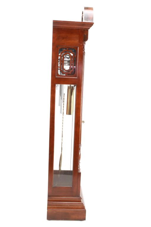 Featured in this lot is a Wellesley model Sligh pendulum grandfather clock originating from 1995. The clock is a Wellesley cable wound, triple chime, grandfather standing clock with wonderful brass workings and accents. The face of the piece displays tooled brass floral designs with moon dial across the top. Sligh Clock Company was in operation from 1968 to 2005 out of Holland, Michigan and had over 25 different designs. The interior of the door displays two brass plaques, one with the serial number and sale information and the second marked "Howard & Grace 2nd Anniversary 1995". The back of the clock is marked in branded lettering and the internal gears read "Sligh Holland, Michigan U.S.A."; the gear plate also shows serial and model numbers. The clock shows wonderful construction with little to no wear. The piece comes with original booklets, instructions, and maintenance guide. The clock measures 79 1/2" tall by 23" wide and 14" deep.