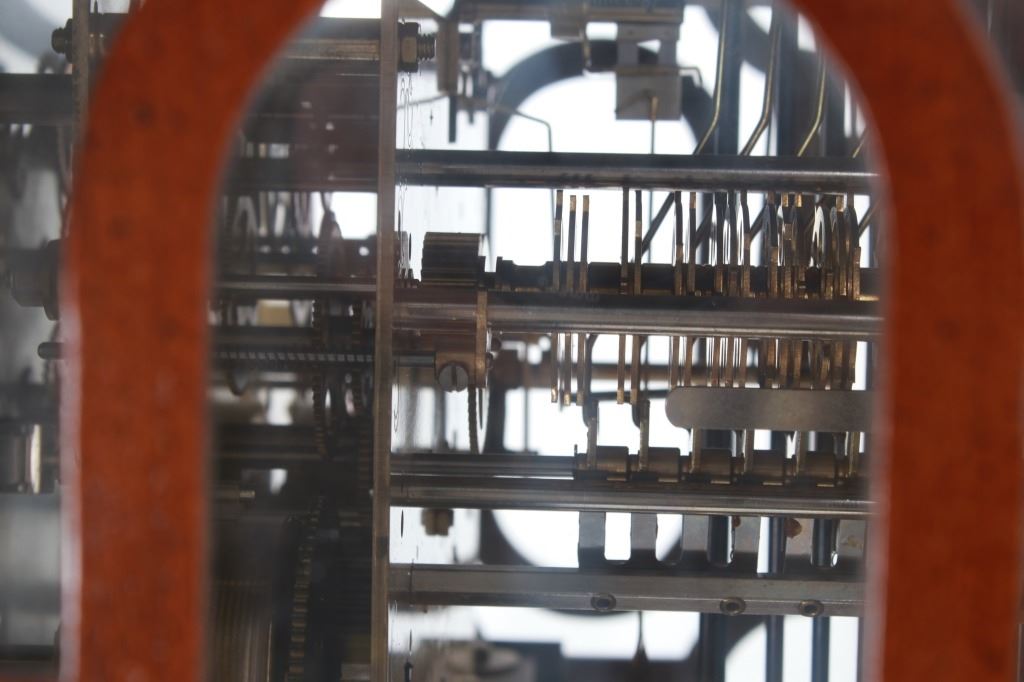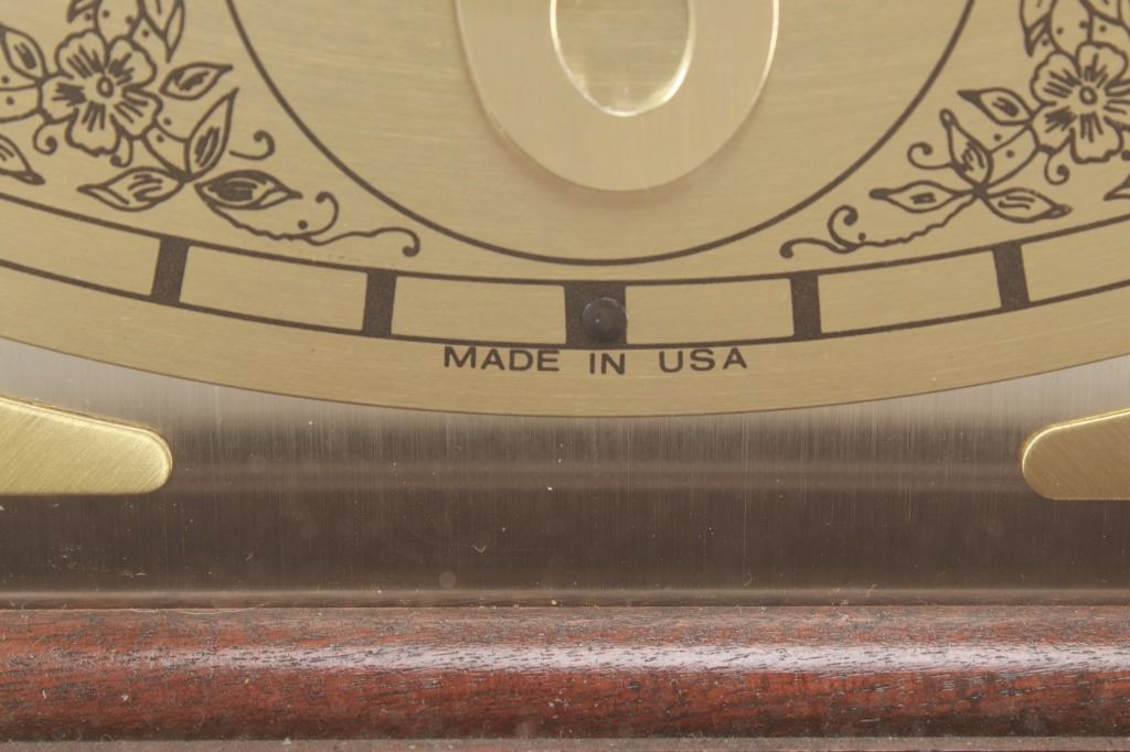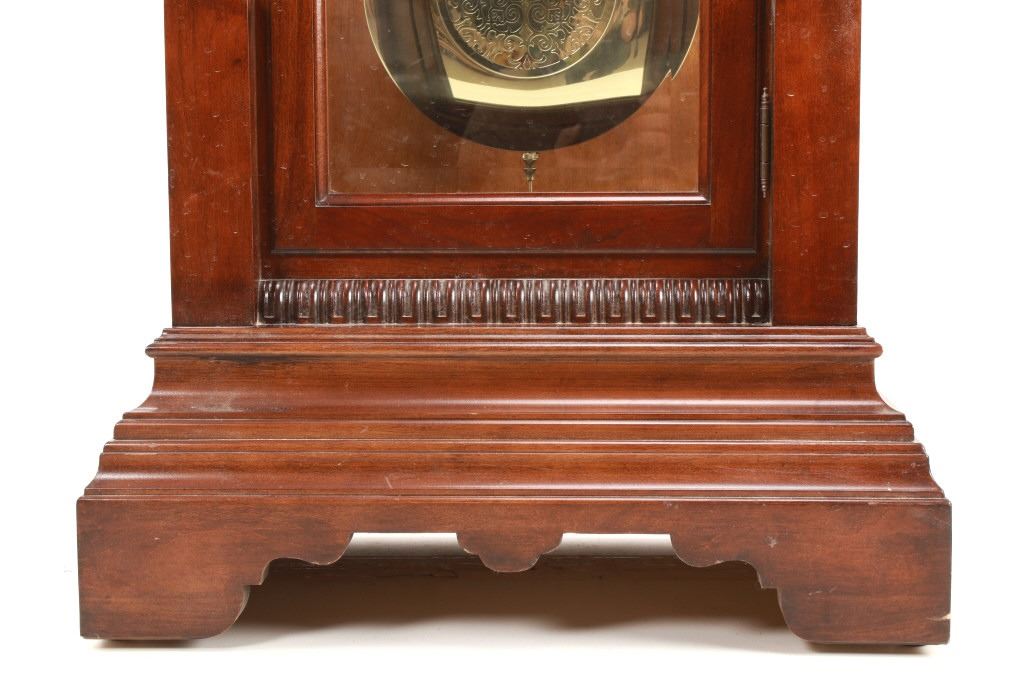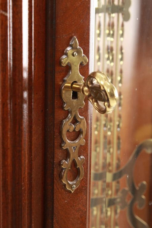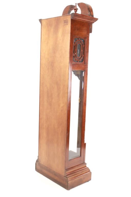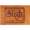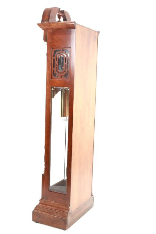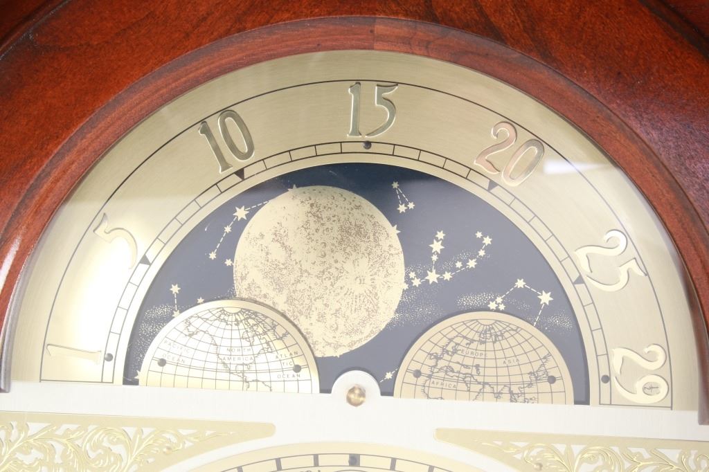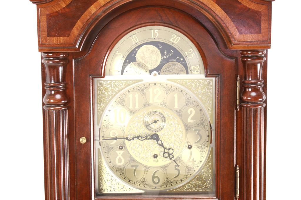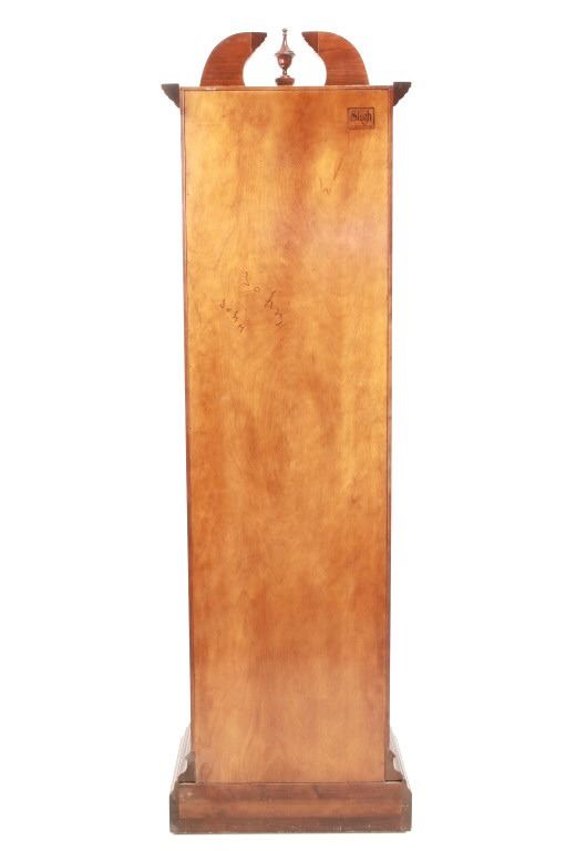 Featured in this lot is a Wellesley model Sligh pendulum grandfather clock originating from 1995. The clock is a Wellesley cable wound, triple chime, grandfather standing clock with wonderful brass workings and accents. The face of the piece displays tooled brass floral designs with moon dial across the top. Sligh Clock Company was in operation from 1968 to 2005 out of Holland, Michigan and had over 25 different designs. The interior of the door displays two brass plaques, one with the serial number and sale information and the second marked "Howard & Grace 2nd Anniversary 1995". The back of the clock is marked in branded lettering and the internal gears read "Sligh Holland, Michigan U.S.A."; the gear plate also shows serial and model numbers. The clock shows wonderful construction with little to no wear. The piece comes with original booklets, instructions, and maintenance guide. The clock measures 79 1/2" tall by 23" wide and 14" deep.