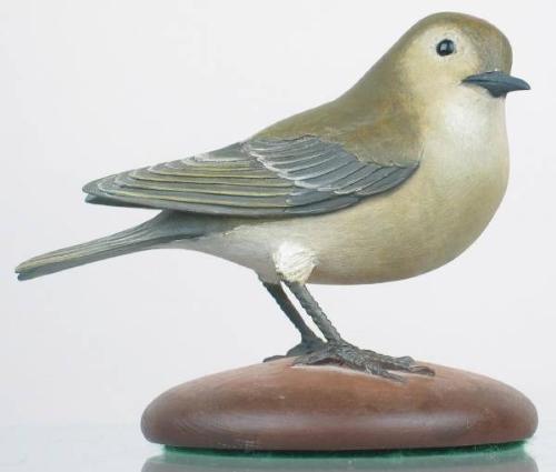 Slightly larger than lifesize ruby crowned kinglet by Frank Finney, noted folk art carver. Beautifully carved with turned head and wing and tail detail. Glass eyes. XOC. Dot og glue visible near the eye. (decoy)