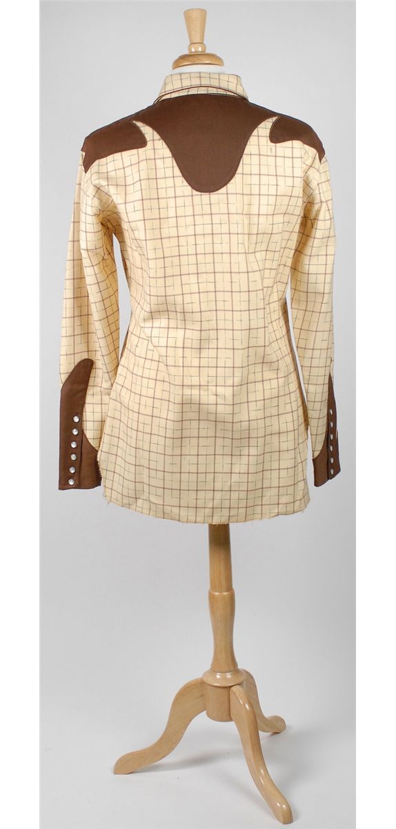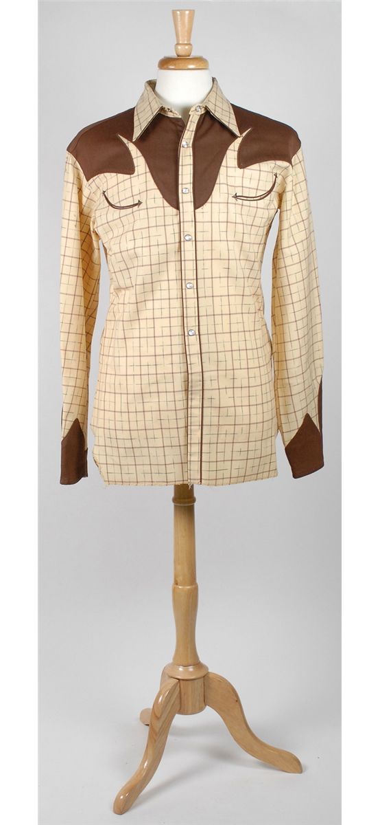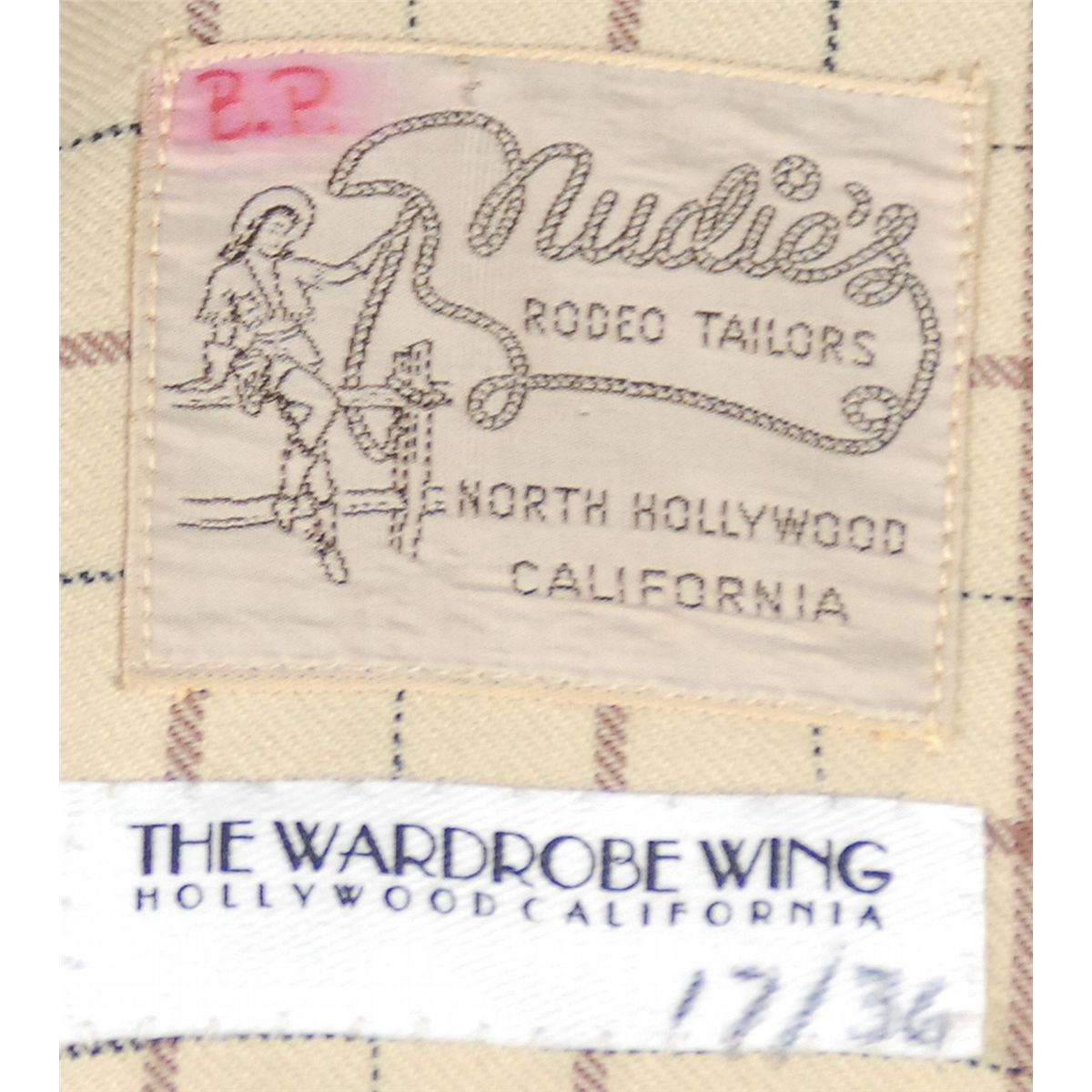 Screen-worn western style shirt worn by Mahoney in the 1957 film Slim Carter. Long-sleeve checkered shirt bears the manufacturing label of the world-renowned tailor to the stars, Nudie Cohn of Nudie's Rodeo Tailors, and features mother-of-pearl snaps on the front and cuffs, with brown cloth highlights to the cuffs and shoulders. A Wardrobe Wing tag has been sewn in under the Nudie’s tag in the collar and the shirt tail bears a label with the typing, “Jock O'Mahoney, 2–57, 3044.” In fine condition. Worn in the scene where Slim is in his room and the blonde is discovered in the shower.