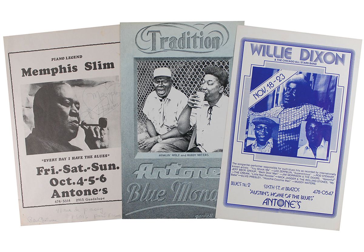 Three original posters (one signed) for performances by famous blues artists at Antone’s Nightclub in Austin, Texas, each measuring approximately 11 x 17, some dates unknown. Posters are for the following shows: Memphis Slim, October 4–6, signed in ballpoint once with his stage name, “Memphis $lim,” and once with his true name, “Peter Chatman,” also adding his address in Paris; Willie Dixon, November 18–23; and a 1987 ‘Tradition’ poster honoring Muddy Waters and Howlin’ Wolf. In overall fine condition, with scattered creases. Originate from the personal collection of Clifford Antone, founder of the club.