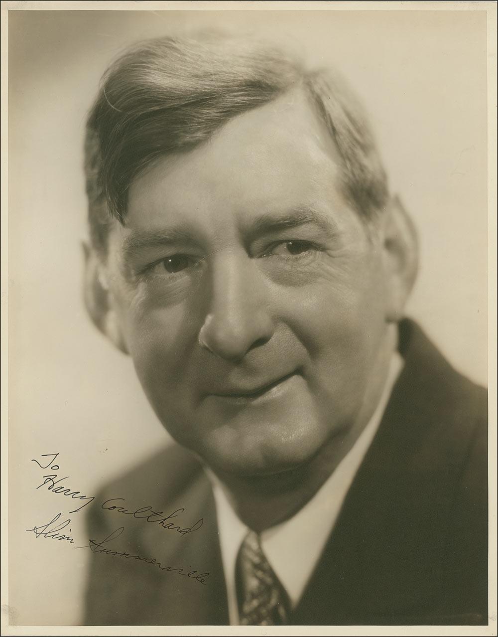 Vintage matte-finish 11 x 13.75 portrait, signed and inscribed in fountain pen “To Harry Coulthard, Slim Summerville.” In fine condition.