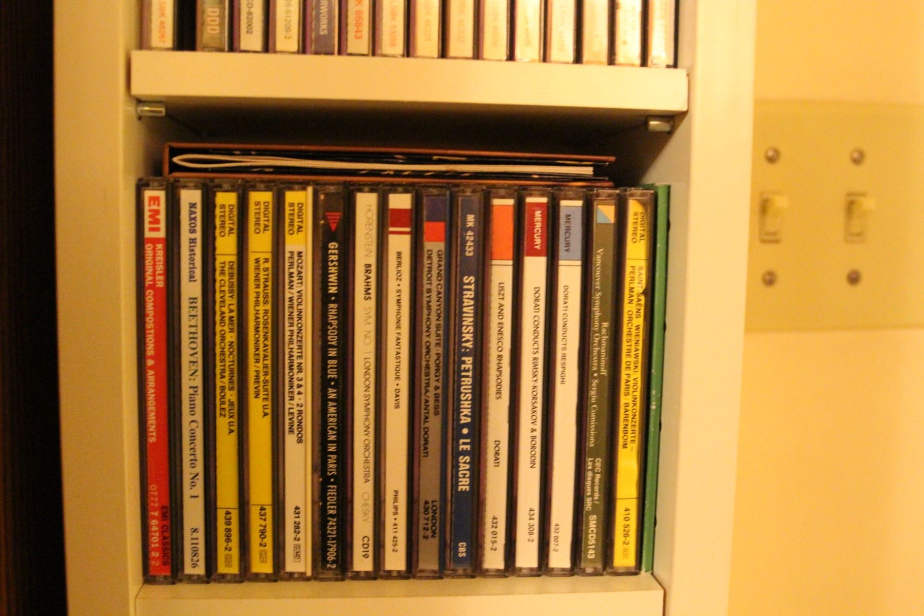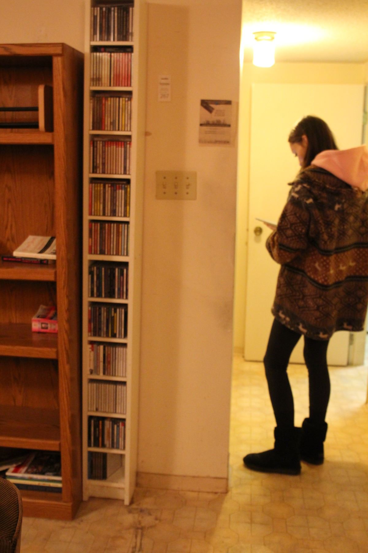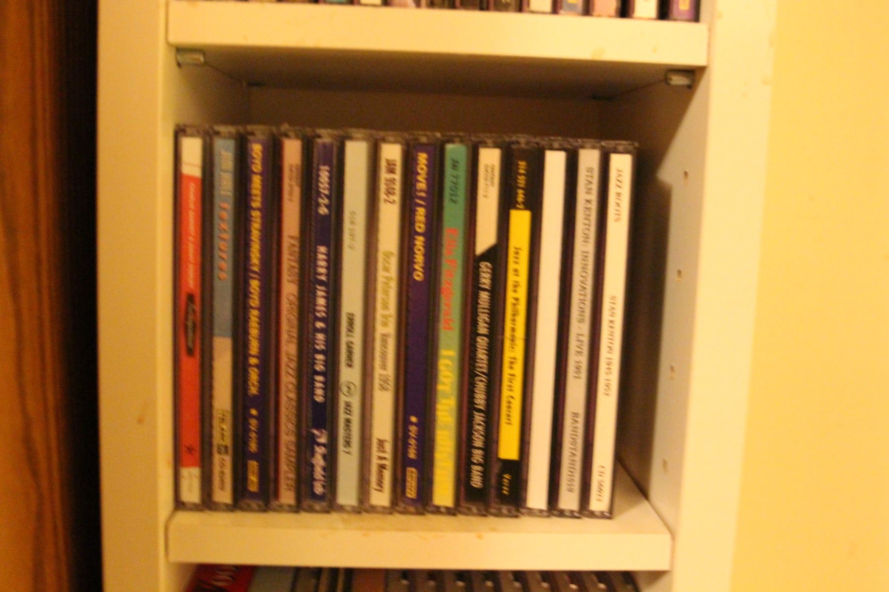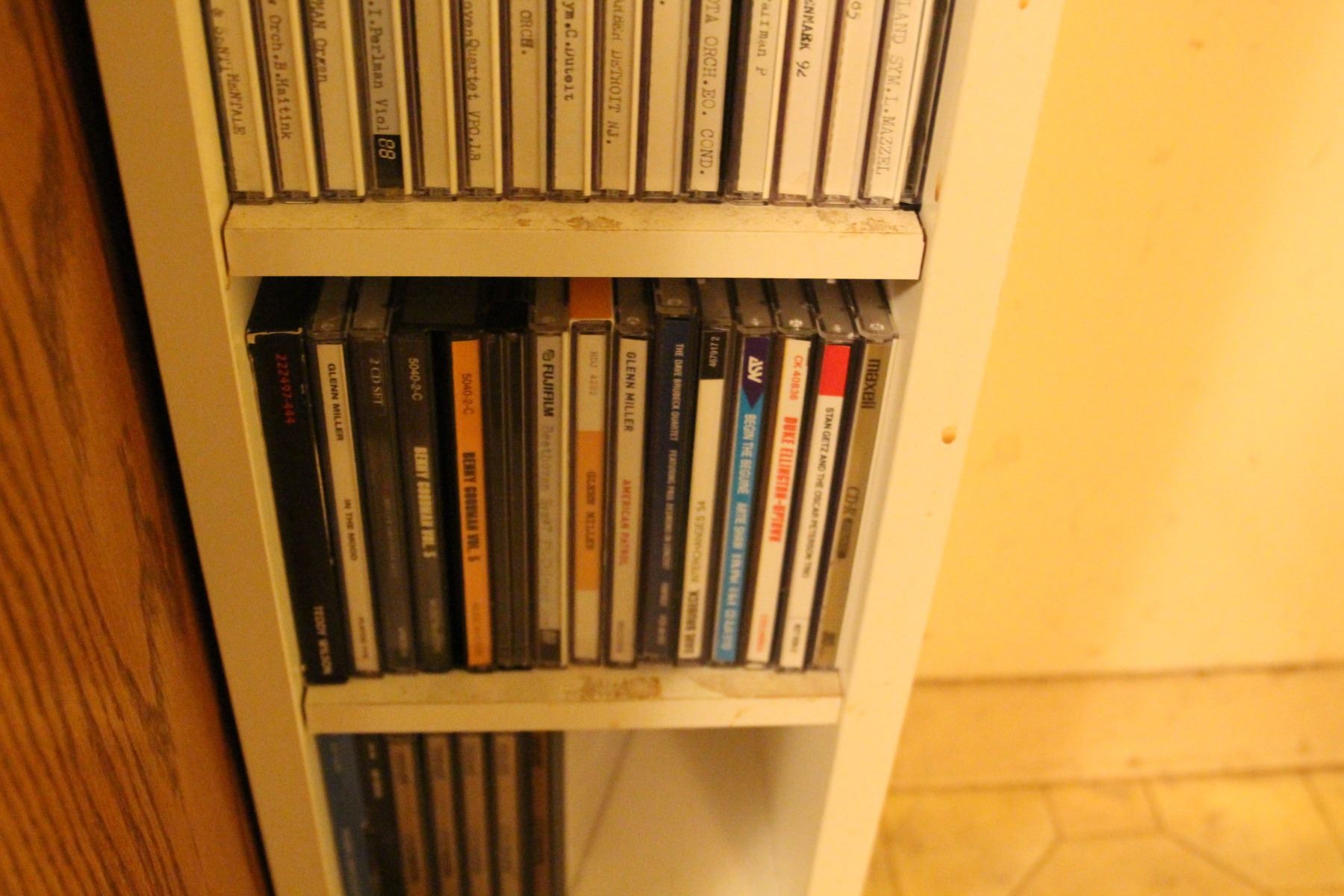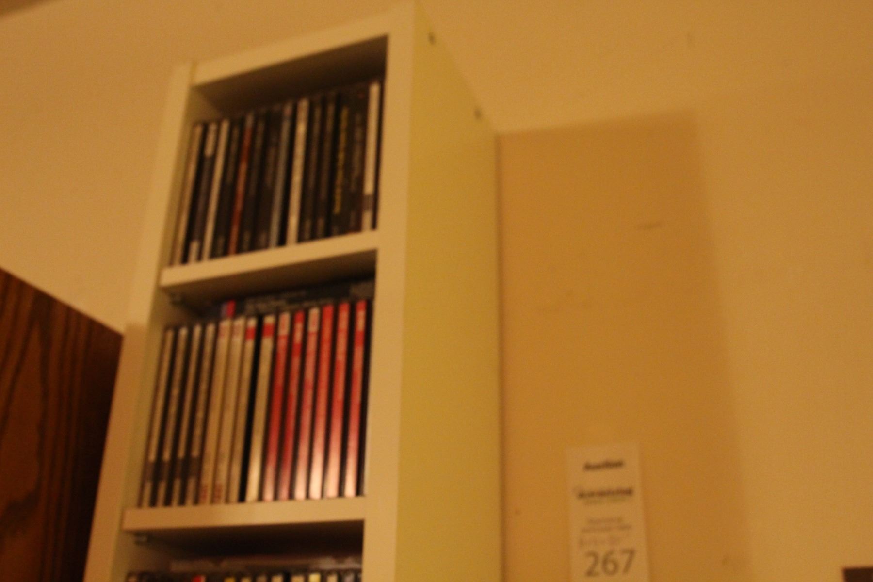 Tall slim white shelving unit 8X7X80 includes CD's. Bring packing material & pickup at 9:00 am - 10:00 am