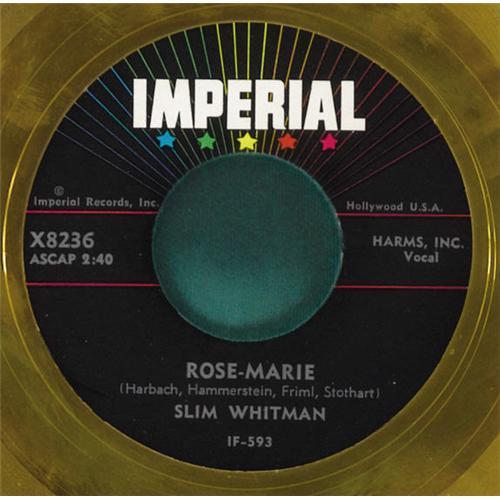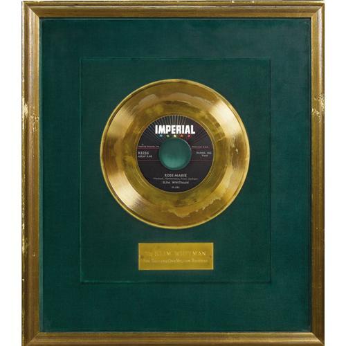 <B>Slim Whitman "Rose-Marie" Imperial Gold Record Award (1958).</B></I> The third Gold Record for Slim Whitman in less than two years was also his last, climbing to a peak of #4 on the Country charts in 1954. Imperial honored the artist with this award some years later when founder Lew Chudd began celebrating his label's million-selling hits. It may have been his last Gold Record, but Whitman's career flourished - he charted hits in every decade from the '50s through the '80s.<BR><BR><b>Shipping:</b> Framed - with Glass, Medium (<a target="_blank" href="http://www.heritageauctions.com/common/shipping.php">view shipping information</a>)