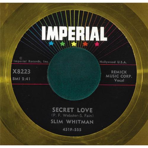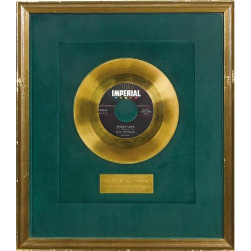 <B>Slim Whitman "Secret Love" Imperial Gold Record Award (1958).</B></I> Doris Day took the song to #1 on the Pop charts in 1954, but Slim also had a big hit with it on the Country charts later the same year, climbing to #2 and enjoying his second biggest hit ever. The man known as "The Smilin' Star Duster" charted 37 times on the Country charts, 11 times achieving Top 10 status. The Gold Record here is one of the more attractive in our set from the archives of Imperial Records founder Lew Chudd.<BR><BR><b>Shipping:</b> Framed - with Glass, Medium (<a target="_blank" href="http://www.heritageauctions.com/common/shipping.php">view shipping information</a>)