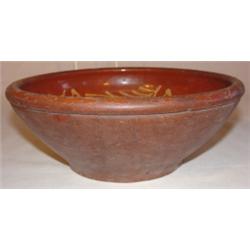 Slip decorated redware bowl. Measures 8 3/4" in dia. and has overall wear to decoration and rim.