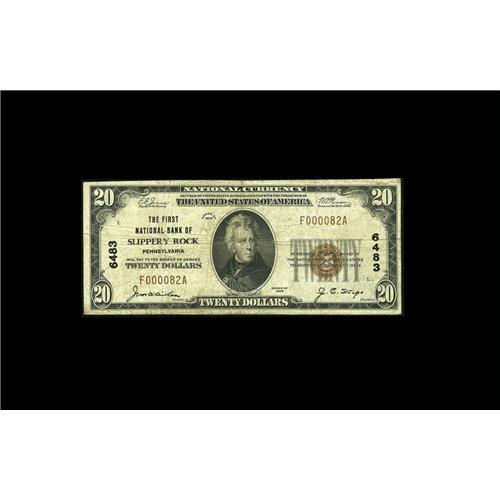 <B>Slippery Rock, PA</B></I> - $20 1929 Ty. 1 <B>The First NB</B></I> Ch. # 6483<BR>A great title from Pennsylvania, with only seven notes available to those wishing to own one. <B>Fine.</B></I>
