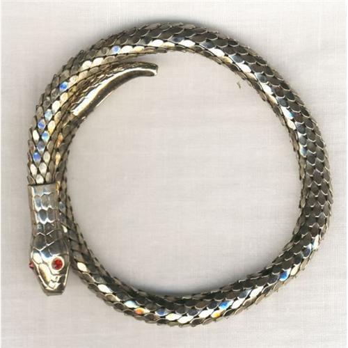 Hisssssss !!! This silver tone snake bracelet is too lifelike for me! Beady Red Rhinestone Eyes, scaly mesh skin, and a pointy tail! <p>This is a large sized bracelet and could be worn as a cuff bracelet. It looks like something Queen Cleopatra might have worn on her upper arm! If you like that look then this serpent is ready to accompany you. A vintage piece with a slithering look just ready to coil around your arm.<p>Condition: Excellent:<p>Measurements: Approximately 3 inches in diameter. (Expandable to accommodate a larger arm or wrist)<p>Please email with any questions and I will be glad to reply. <p> : Unsigned Serpent
