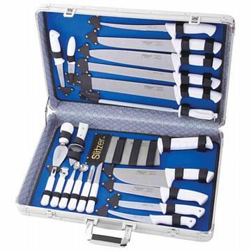 Slitzer 22pc Professional Cutlery Set in Case **|**|** Each ergonomically designed, well-balanced knife features full-tang construction for heavy-duty durability. Blades are finished with satin polish that resist corrosion and pitting. All store in their special 23" x 15-1/2" x 4-3/4" aluminum case that can also double as a hard-sided briefcase. Set includes cleaver, sharpener, 12" fish knife, 12" slicing knife, 12" chef knife, 10" utility knife, 9" fish knife, 8" utility knife, 8" chef knife, 6" boning knife, 6" utility knife, 6" fillet knife, 4" paring knife and 8pc small gadget set (decorating knife, lemon grater, decorating scoop, oyster knife, cheese knife, multi-use knife, potato peeler and melon baller). Limited lifetime warranty.