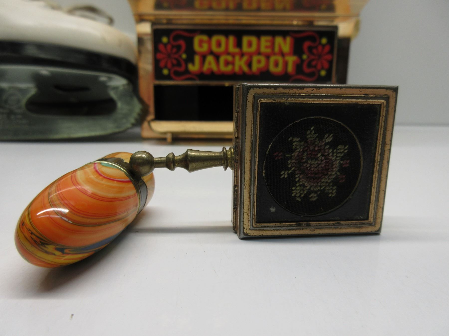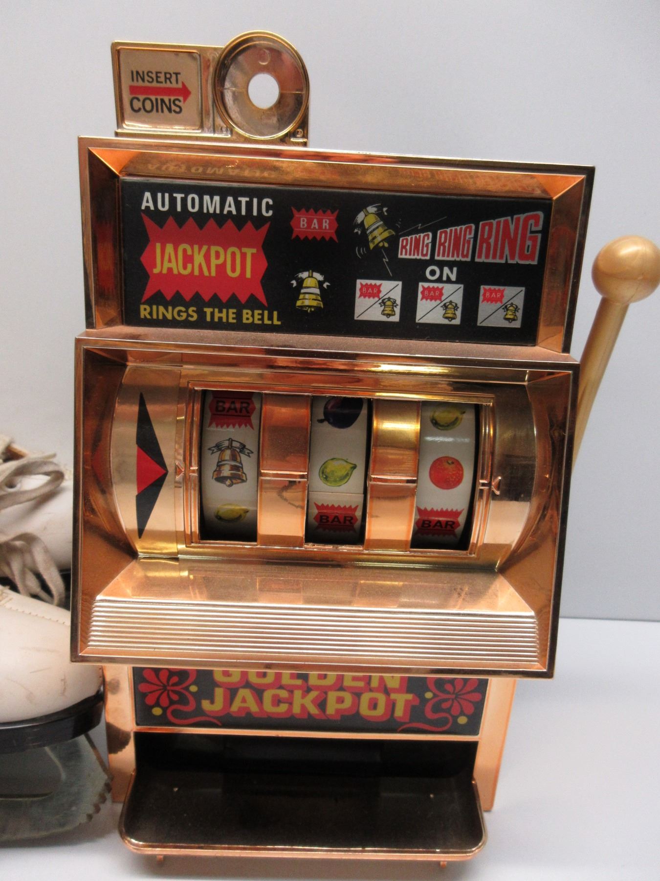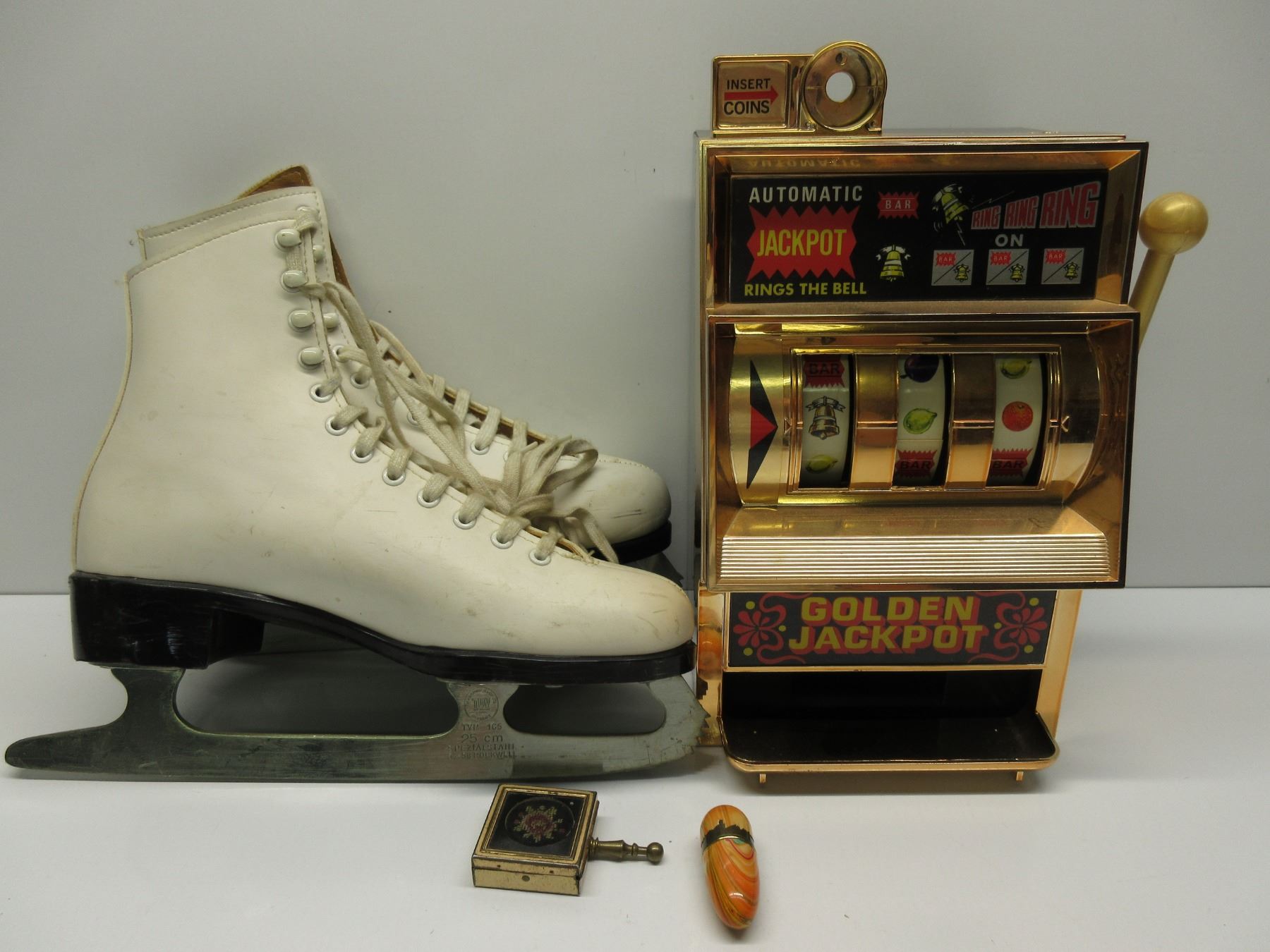 Slot Machine Bank, Purse Ashtray, Sewing Kit, Skates size 7