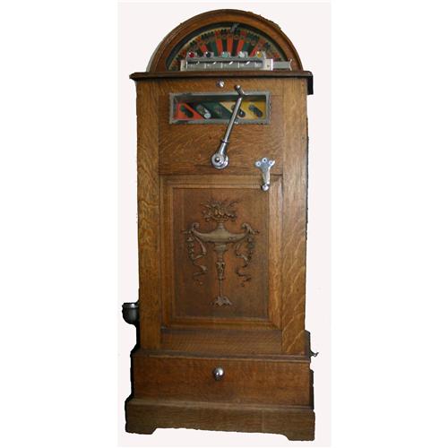 1897 Berger Nickel Upright Slot Machine in oak case. Excellent original condition. Measures 57"H x 24"W x 16"D. The earliest uprights operated on batteries. Mechanical marvels that thrilled patrons then as they do now.
