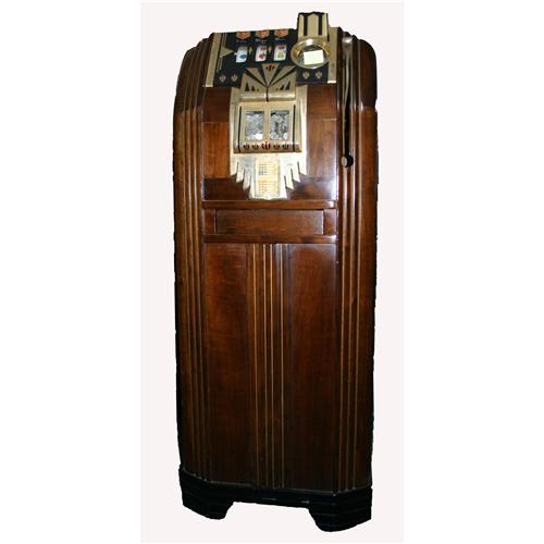 1937 Pace Royal Comet 10 Cent Console Slot Machine. Walnut case. Excellent condition. Spectacular Art Deco Club Slot. Jackpot feature. Detailed castings. 59" T x 22" W x 17" D. .