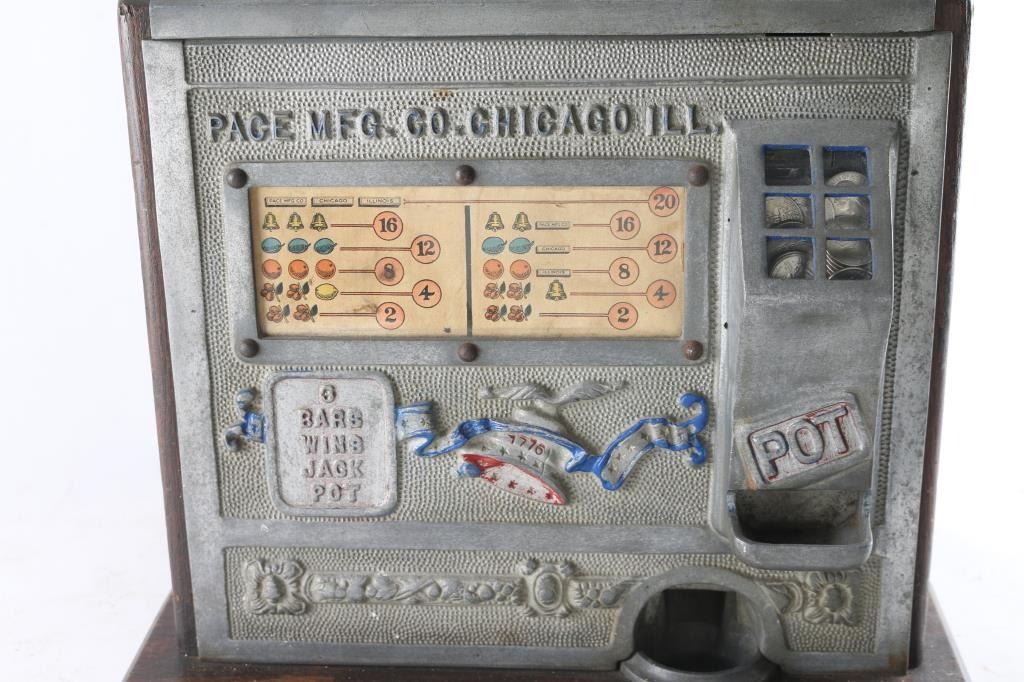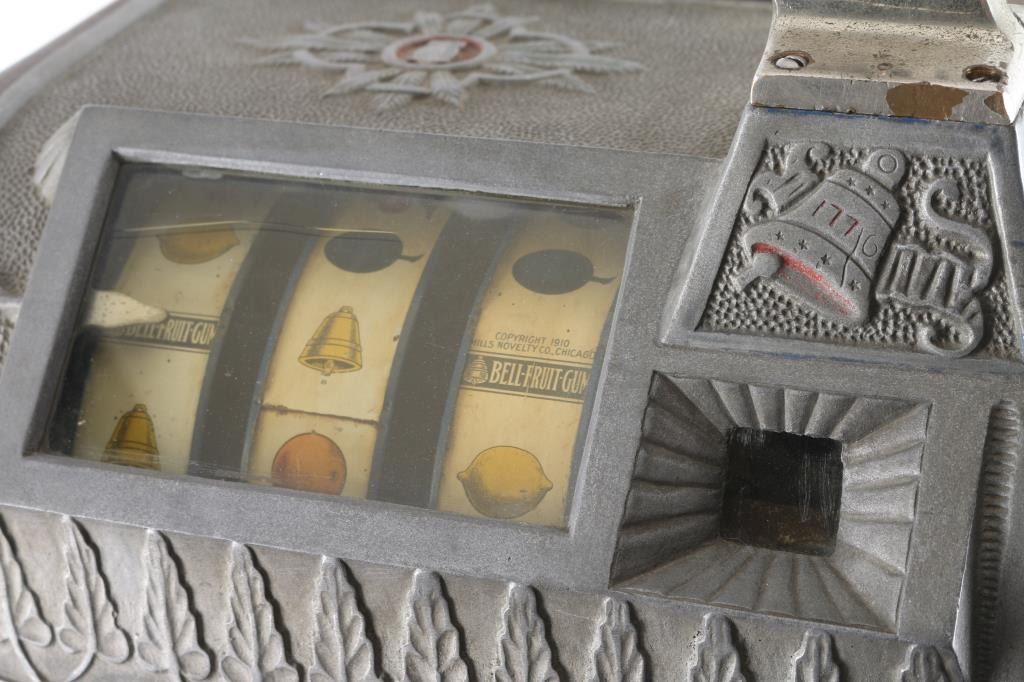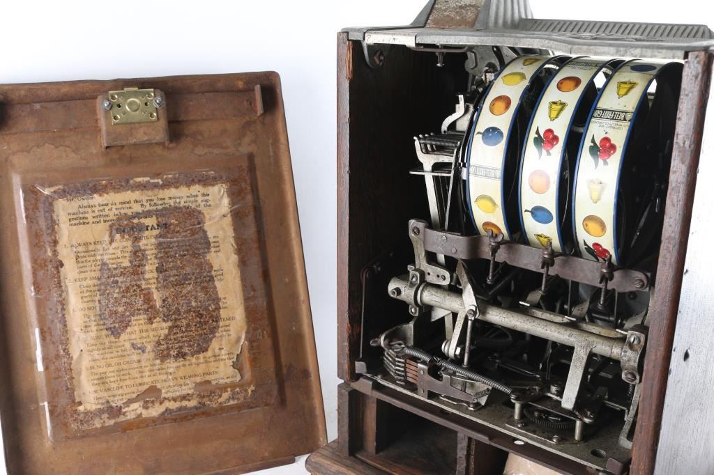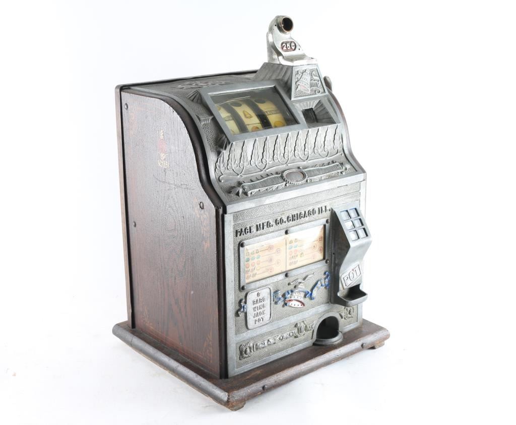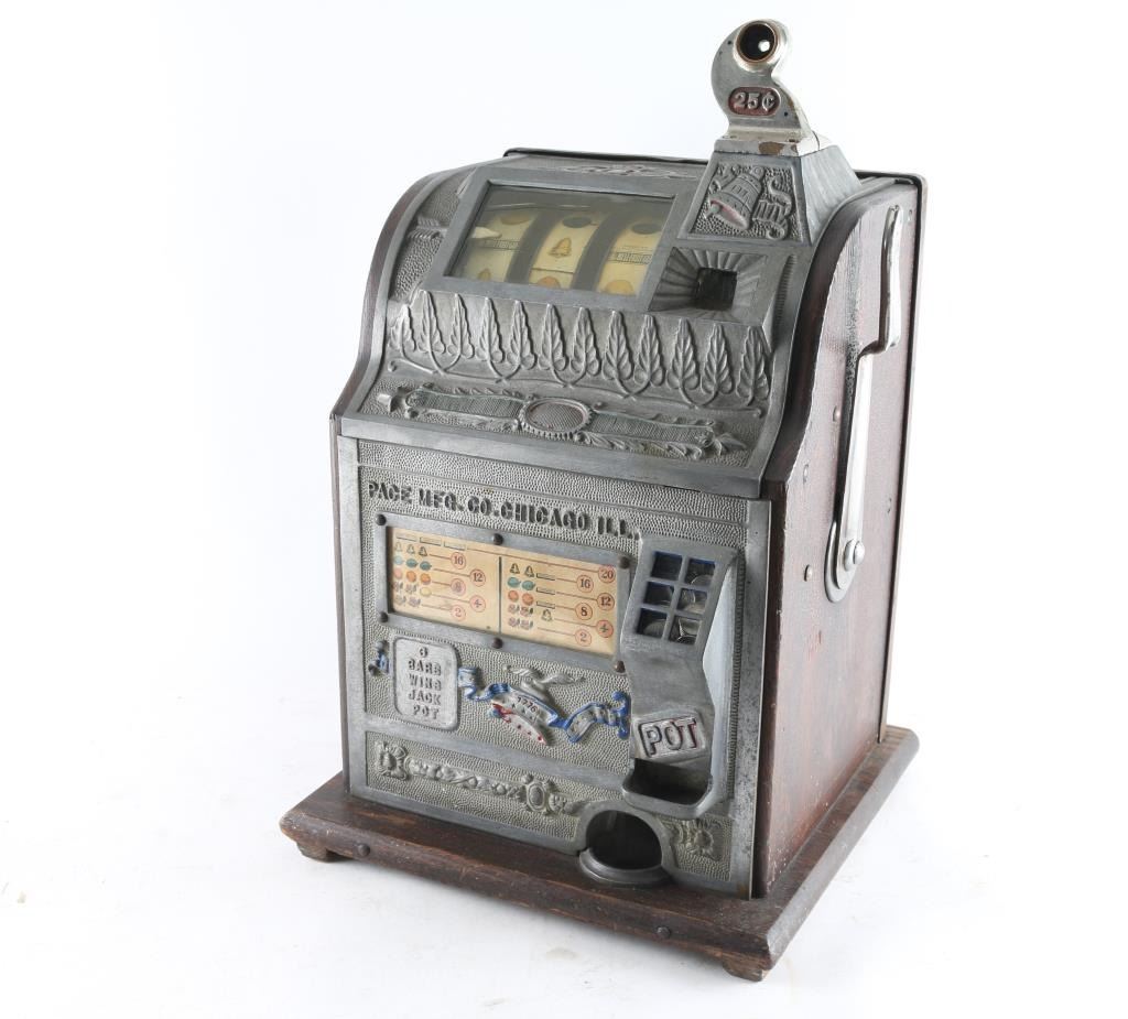 (Herbert) Mills Manufacturing began making slot machines in 1907, called the "Liberty Bell", and by 1908 were call "the bells". This 'Operator Bell' has the Pace Conversion installed. This is a rare 25 cent slot machine, for the 1920's and 1930's. This is unrestored and in working condition, the glass has a crack. This is called a front-load jackpot. This has a modern lock and key installed.