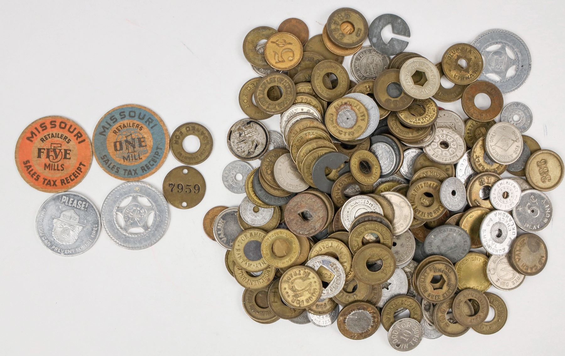 Miscellaneous lot of 186 slot, vending, arcade, tax tokens including many varieties: Watling, Columbia, Liberty Bell, many rare slot tokens. Telephone phonograph, skill games.