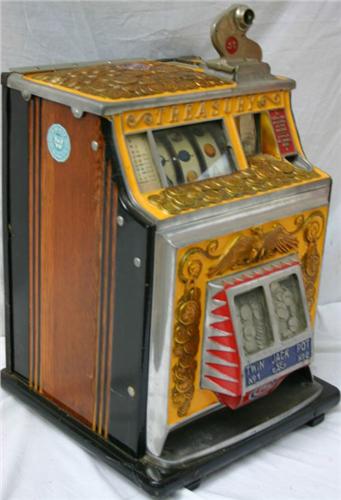 5 Cent. Original in every detail. The colorful gold coins are hanging all over the front castings as well as the top of the machine. This machine has absolutely superb aged patina resulting in a beautiful color tone. Works.