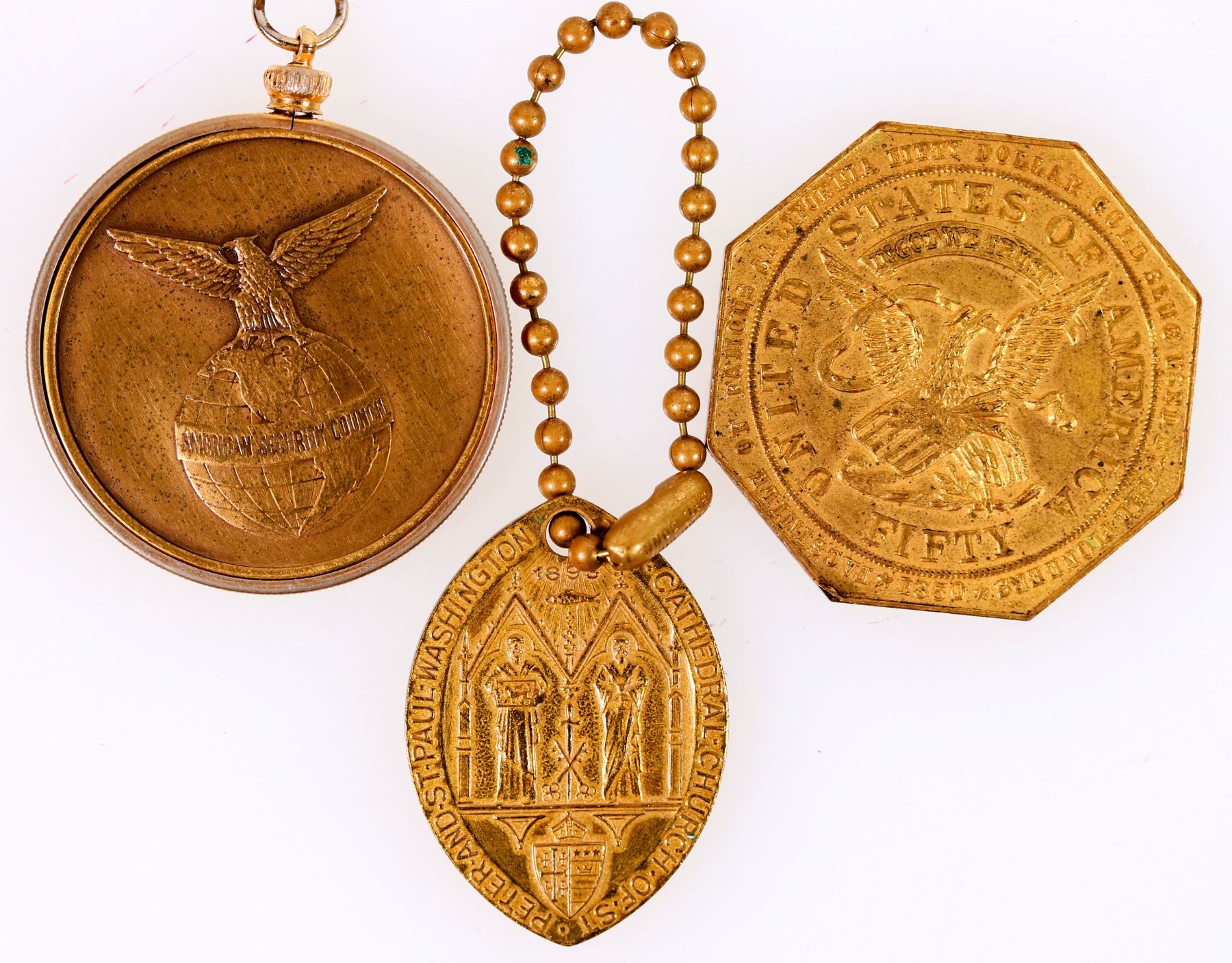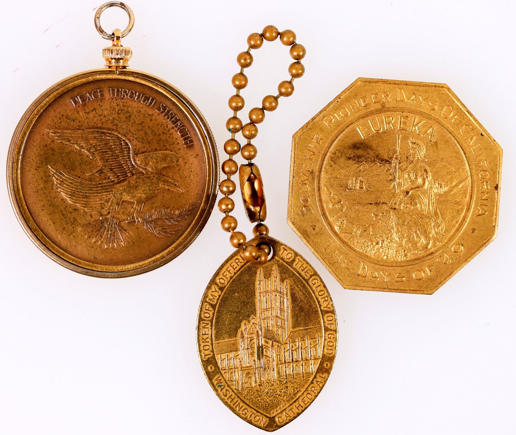 Days of '49 Souvenir Pioneer Days of California; 40 mm; Washington Cathedral medal, on a key chain; American Security Council, Peace through Strength, in bezel.