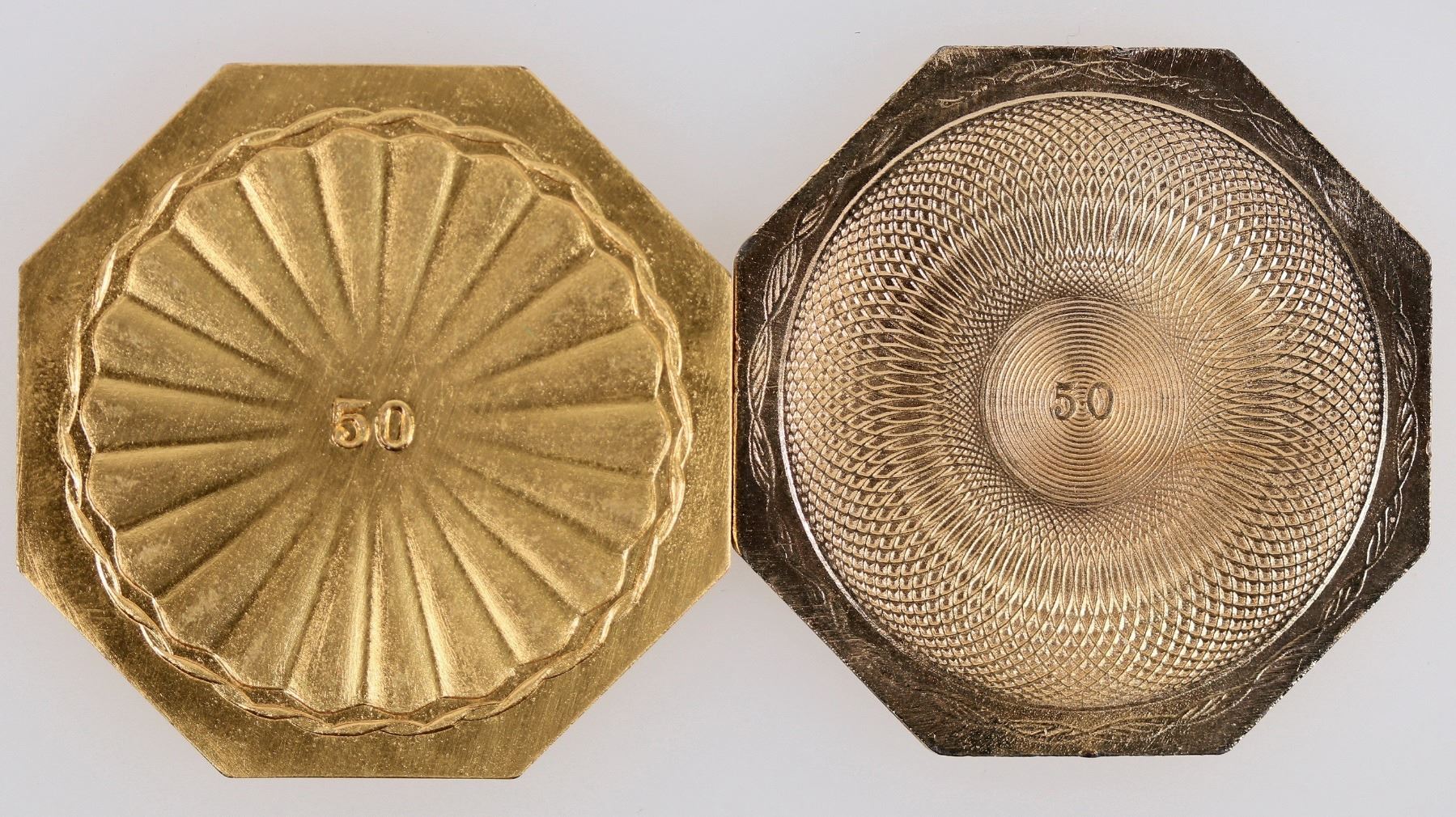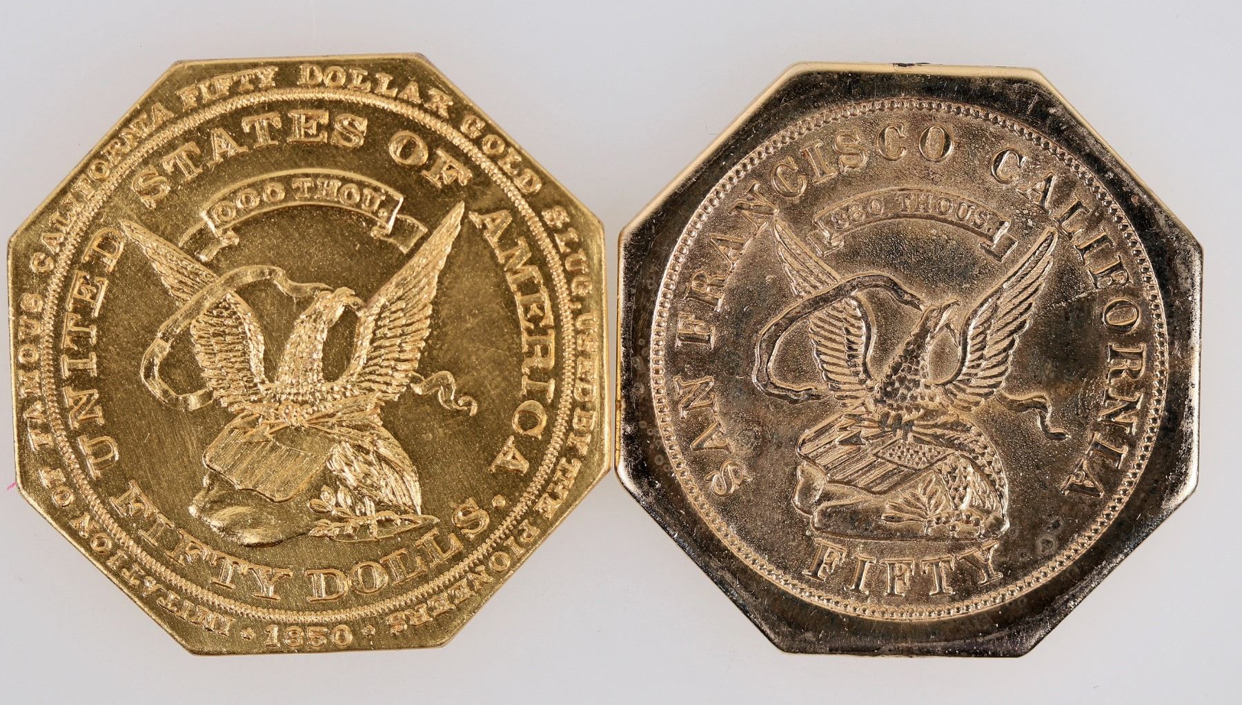 Two different $50 slug facsimiles, each octagonal and 40 mm. Nice replicas.