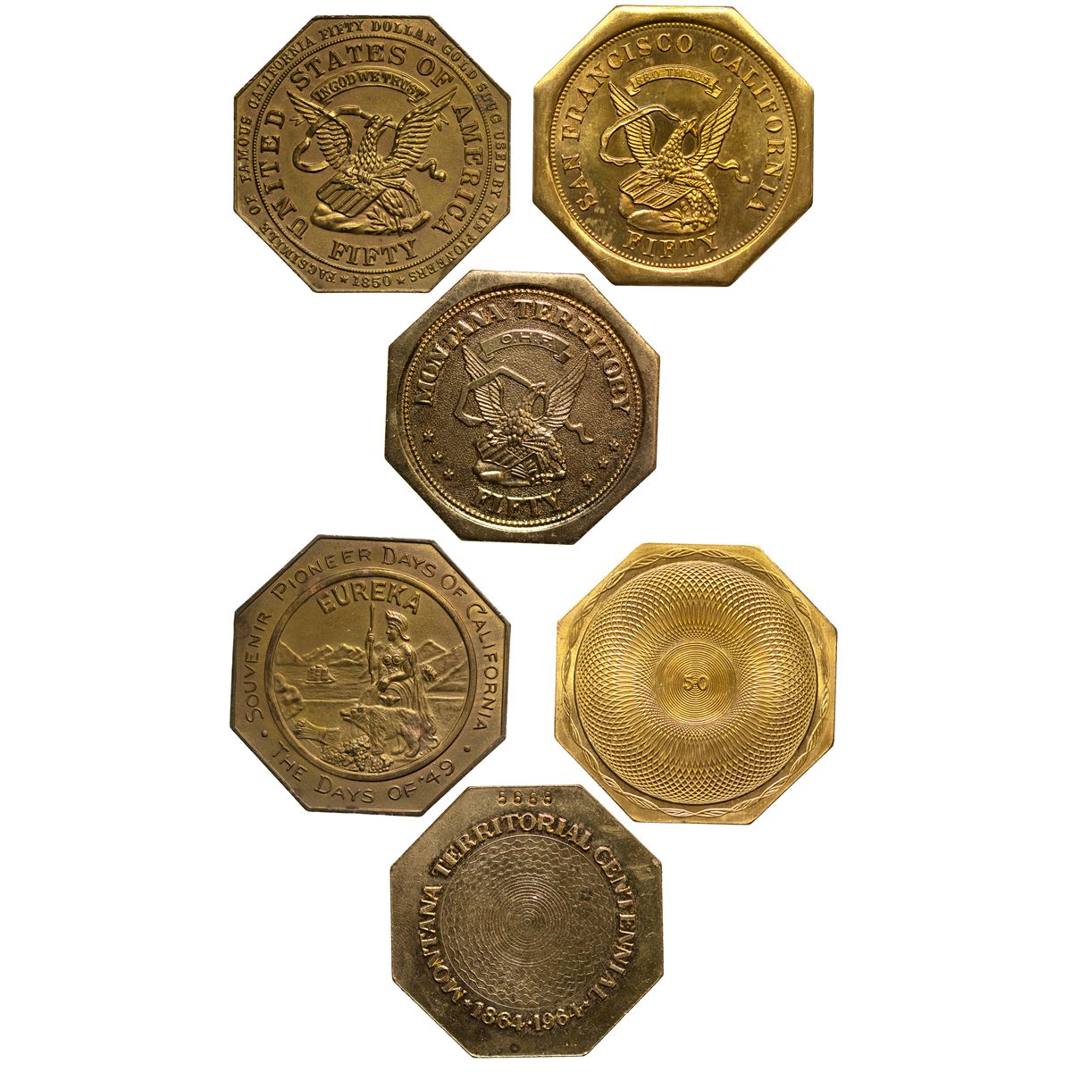 Lot of 3. $50 Dollar Gold Piece on obverse (typical of all 3), Montana Territorial Centennial 1864-1964 on reverse. Souvenir Pioneer Days of California from Eureka on reverse.