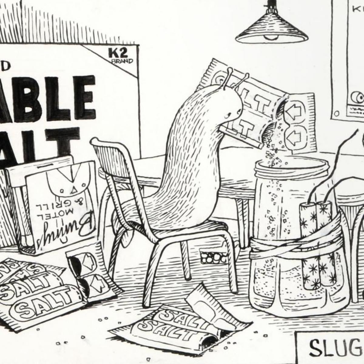 Enter a surreal and satirical world of twisted imagination and award winning creativity. "Slug Terrorist" is an original pen & ink drawing on paper by Dan Piraro, creator of the critically acclaimed and award winning comic strip, Bizarro! This piece is hand signed and comes framed. Includes Certificate of Authenticity! Measures approx. 22.5" x 16.5" (with frame), 13" x 7" (image). ** Please note: there is minor scratches on the frame. **