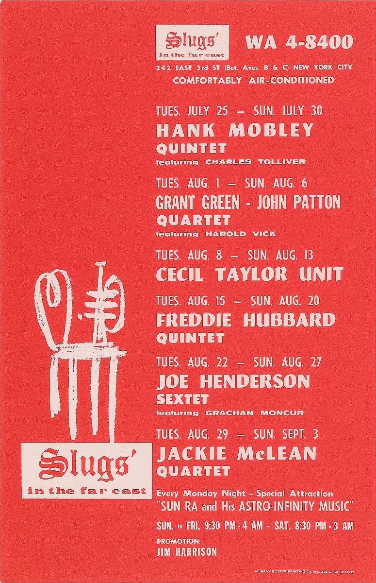 Collection of six unsigned handbills for Slug’s Saloon in New York, each one page, 5.5 x 8.5, dating from 1966 to 1969, featuring acts such as Sun Ra, Charles McPherson, Yusef Lateef, Wynton Kelly, Joe Henderson, Lee Morgan, Roland Kirk, Freddie Hubbard, Jackie McLean, Art Farmer, and Hank Mobley. Lee Morgan, who is featured on two of the handbills, was killed at Slug’s Saloon in 1972 when he was shot by his common-law wife. In overall fine condition. The jazz club was situated in Manhattan’s Lower East Side and drew popular performers despite its seedy location. The Larry Rafferty Collection.