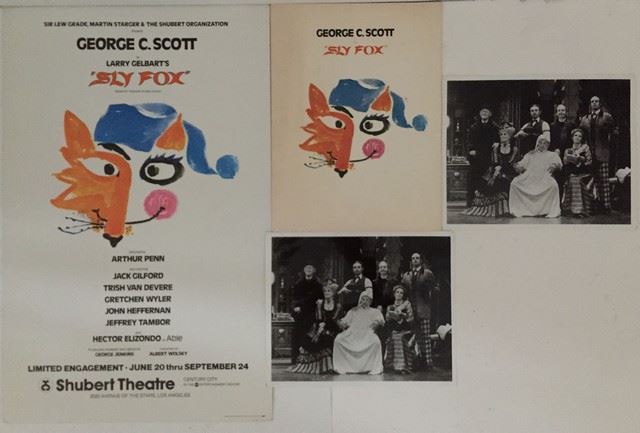 Sly Fox poster on cardboard (original) – comes with playbook includes signatures of everyone in the play and cast photos (x2) . 1976 THEATRE PROGRAM SLY FOX, SINGED BY GEORGE C SCOTT & MOST OF THE CAST. Purchased at an estate sale. From the Shubert Theataer in Los Angeles. This is an original and not a reproduction. The Larry Gelbart play (based on Volpone by Ben Johnson) opened in NYC on 12/14/76 and ran for 495 performances. The Program is from the SHUBERT THEATER and features artwork by Chava, cast and production credits, dates and theatre credit.