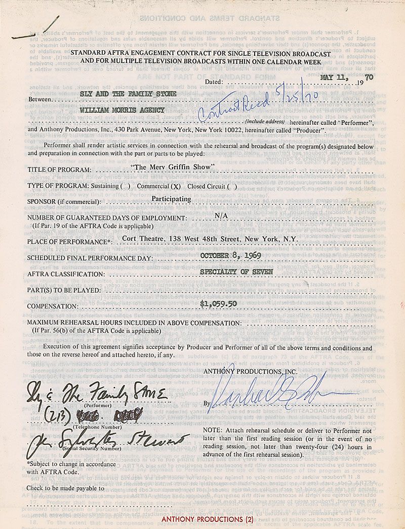 DS, one page, 8.5 x 11, May 11, 1970. Standard AFTRA contract in which Stone agrees to appear with his band on The Merv Griffin Show on October 8, 1969 [seemingly a typo], in exchange for $1059.50. Signed at the conclusion in black felt tip by Stone, “Sly & The Family Stone,” along with his given name, “Sylvester Stewart.” Standard AFTRA and band-specific riders are stapled to the main document in the upper left. In fine condition, with expected document wear.
