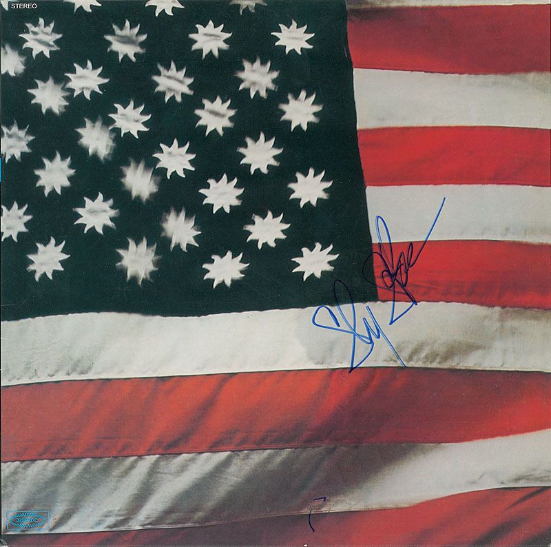 There’s a Riot Goin’ On album signed on the front cover in blue felt tip by Stone. In fine condition, with a stray ink mark to the bottom. The record is included.