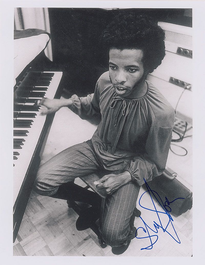 Glossy 11 x 14 photo of Stone with his hand on a piano, signed in blue felt tip. In fine condition.