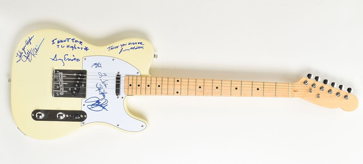 Cream-bodied Telecaster-style electric guitar, signed on the body in blue felt tip, "Take you higher, Cynthia Robinson," "I Want to T U Higher, Greg Errico," and "Take you higher, Jerry Martini," and on the white pickguard, "Freddie Stone," "Larry Graham," and "Sly Stone," who adds the inscription "To John." In fine condition, with some scuffs to body and some ink smudging, not affecting the signatures.