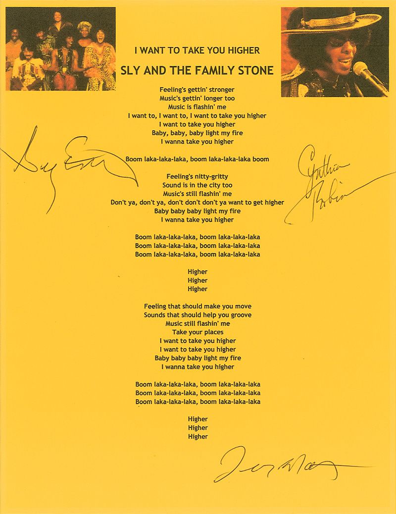 Souvenir printed lyrics to ‘I Want to Take You Higher,’ on a yellow 8.5 x 11 cardstock sheet, signed in black ballpoint by Gregg Errico, Cynthia Robinson, and Jerry Martini. In very fine condition.